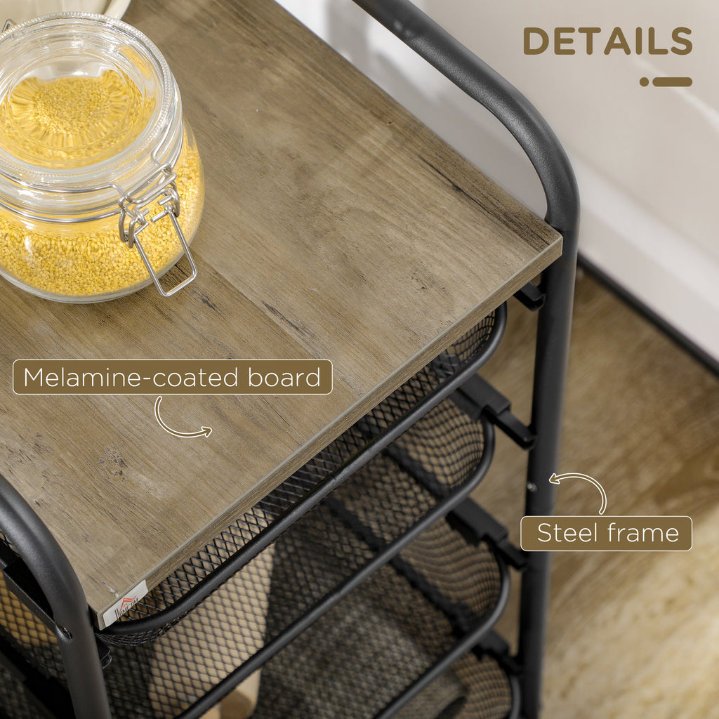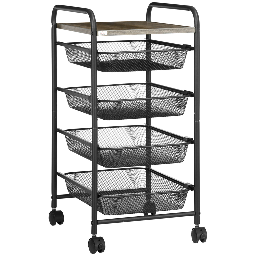 Whether it's the office, bathroom, beauty room or kitchen, you'll always have a handy storage companion with this HOMCOM trolley cart. A metal frame for a strong core, the four-wheel base moves it around easily, with two brakes to secure in place when you want. Comes with four baskets - the mesh prevents liquid build-up, so is suitable for bathrooms and kitchens. Complete with a particle board top shelf for extra holding room.