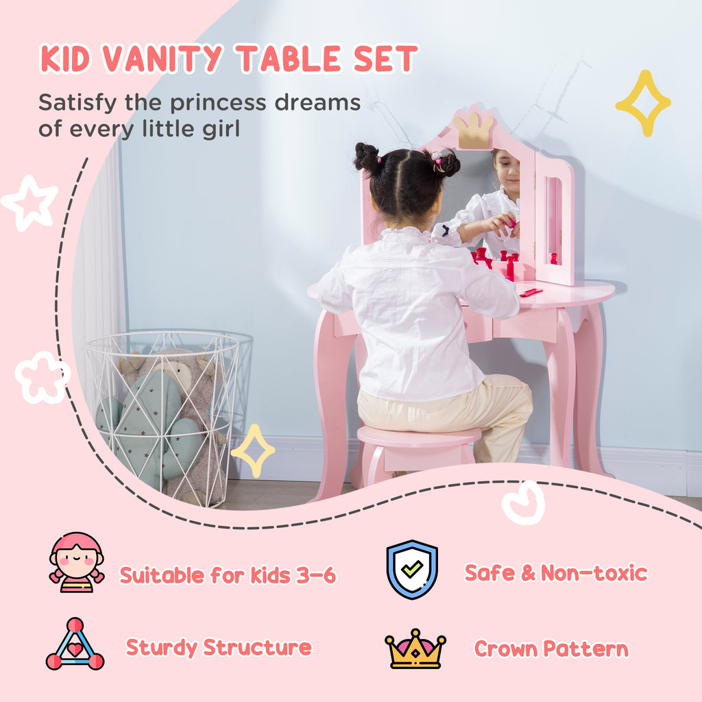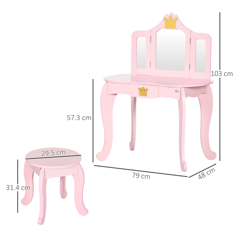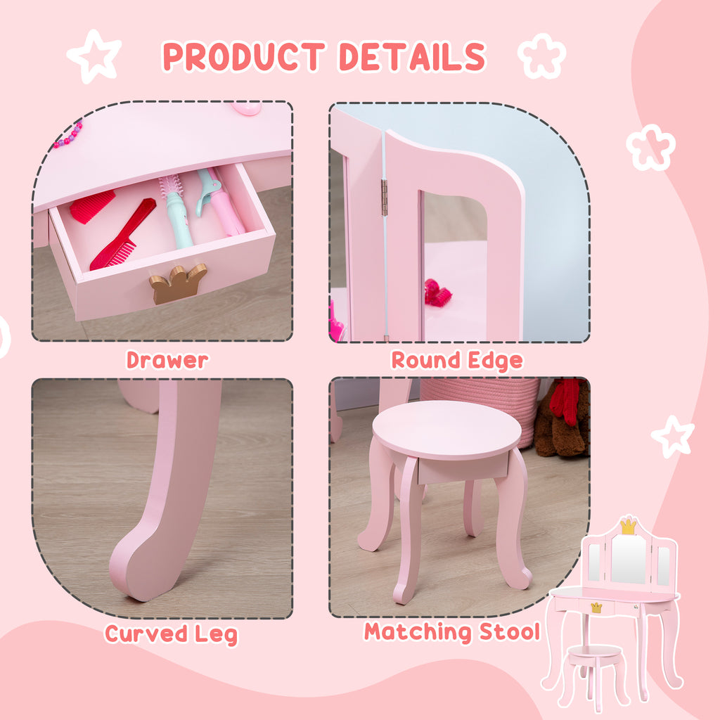 Add magic to your child's room – this HOMCOM kids dressing table and matching stool has a princess theme. Its cute appearance will capture their immigration, creating a fun atmosphere, where they'll play, style their hair, do their makeup and more. With three acrylic mirrors, the two on the side are rotatable, giving them different angles to look at. Everything will stay tidy, thanks to the large table top and drawer. Finished with smooth. rounded edges, it's a safe space for fun and creativity.