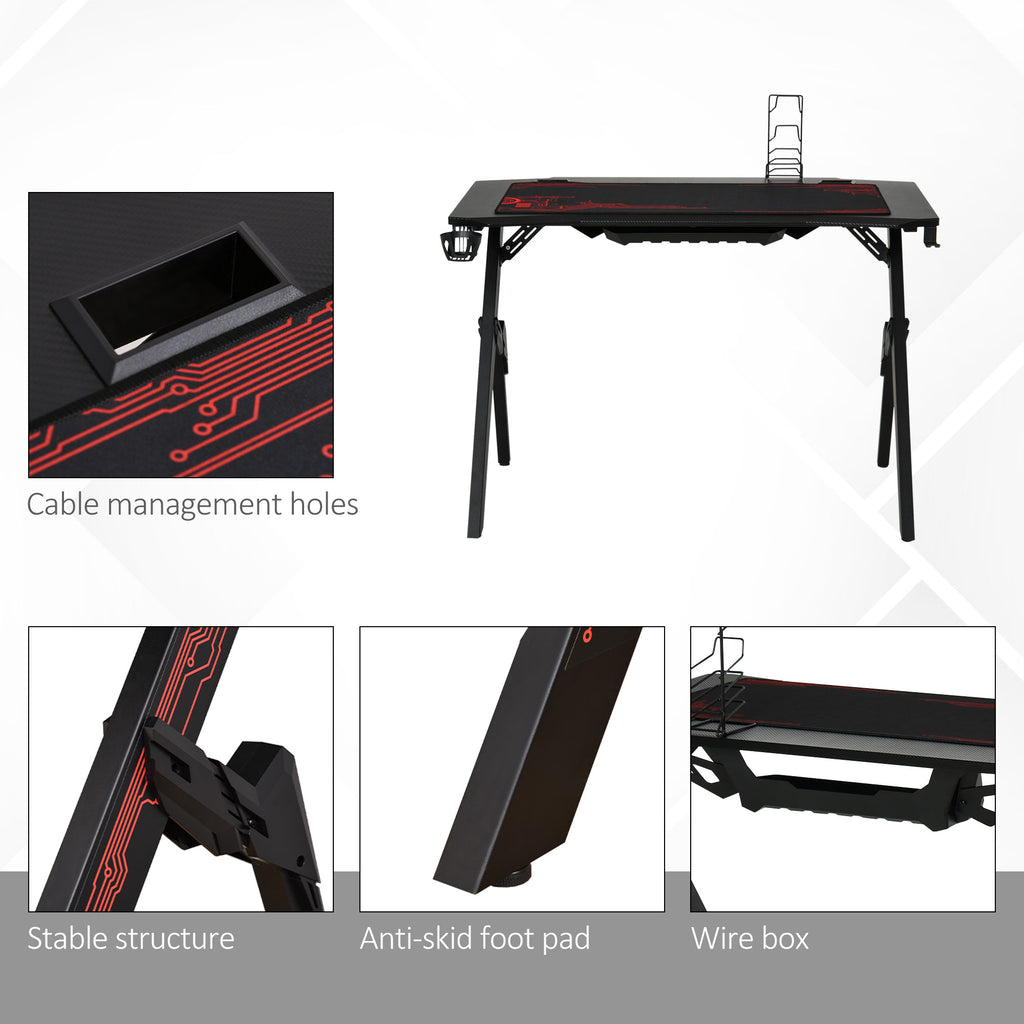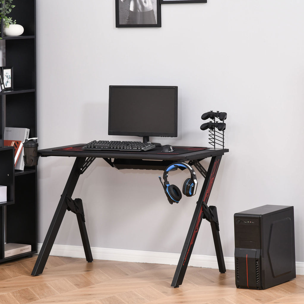 This HOMCOM gaming desk is designed for game lovers: it's got everything you need to space out and play, at any time. A steel frame means a strong structure, with scissor-shaped legs for extra balance and support. Table comes with earphone hook, cupholder, five-layer game handle holder, left and right wire hole and under-table wire box: you can keep all gaming accessories together. Gamer desk comes complete with a carbon-fibre-feel tabletop panel, in a cool black and red patterned design.