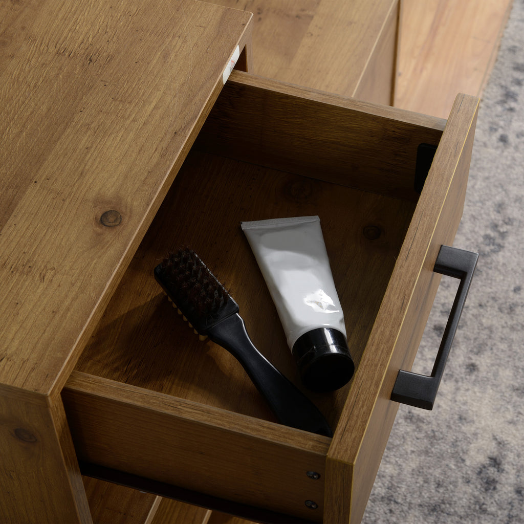 - Comes with six hooks, a drawer, cabinet and shelves to store all outerwear essentials