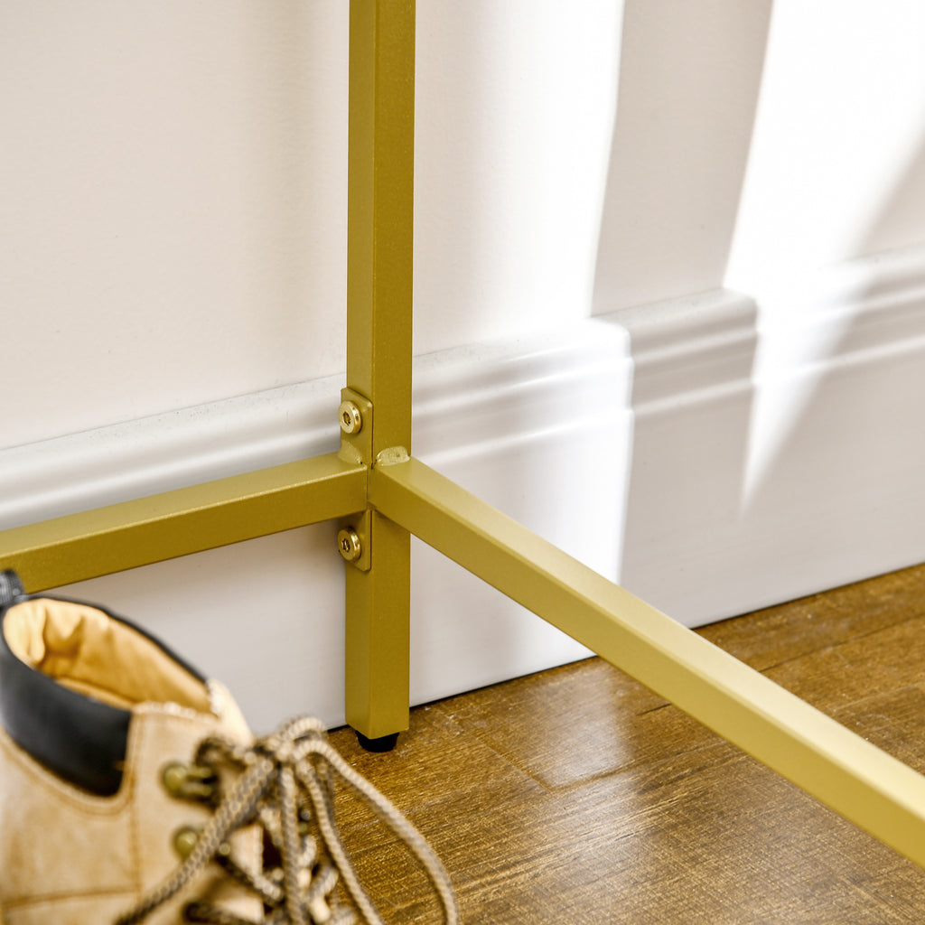Blending style and storage function together, this sofa console table from HOMCOM is a distinctive piece of furniture you'll love having at home. Our console tables for hallway feature a spacious desktop to display photos, ornaments, keys or earrings and the open space underneath for you to place several container box or shoes. Tempered glass tabletop and solid steel frame ensure your stable daily use. Embrace modern chic in your living room, bedroom, and entryway.