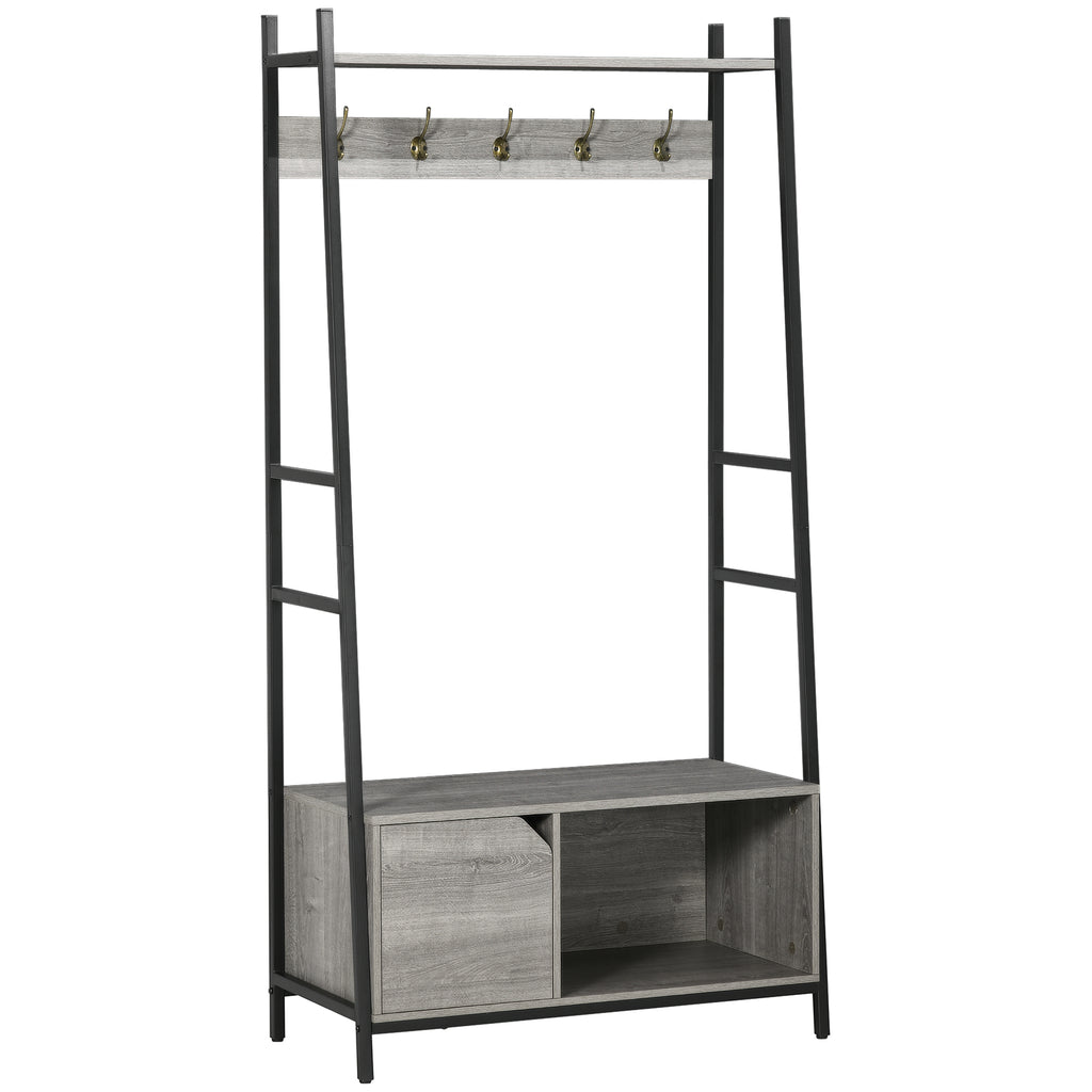 Hopping on one leg to put your shoes on? Forget about that with this hallway bench rack, from HOMCOM. Keep coats, bags, shoes and other outerwear. It comes with five hooks and a bottom shoe storage cabinet. Top shelf for extra holding room. The lower bench gives room to put shoes on and take them off in comfort. Great for home and office entryways.