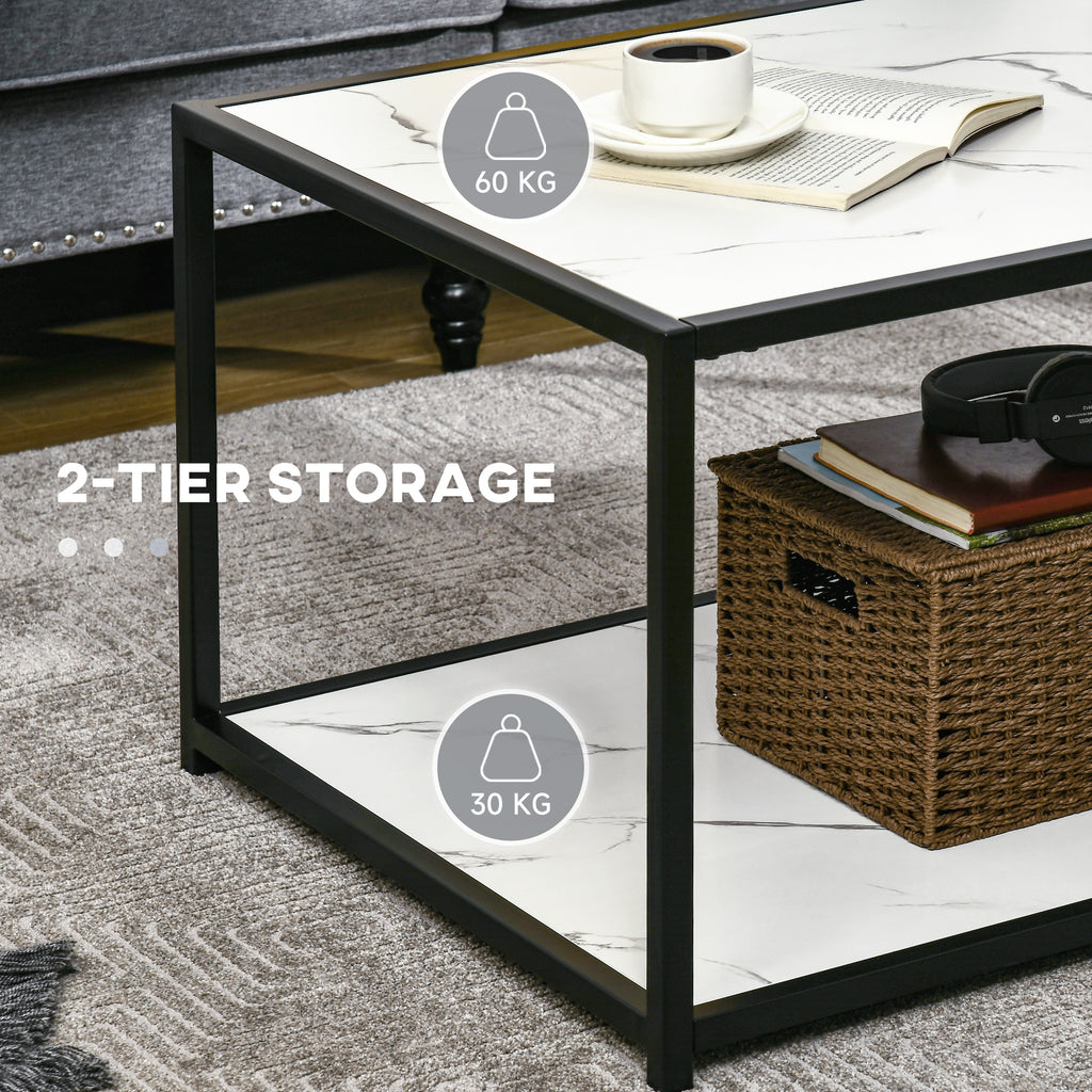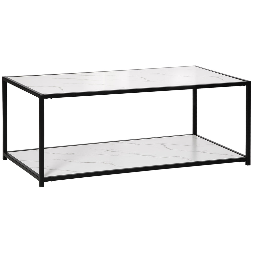 Compliment your home with this HOMCOM coffee table with storage, which has faux marble panels for a decorative touch. There's a tabletop and a bottom shelf, so you can place your flowers, coffee and ornaments on the top, whilst using the bottom for books, magazines and other household items, keeping your home tidy and clutter-free. Made with a strong steel frame, the cocktail table can hold up to 30kg – whatever is placed there, will be secure. This low coffee table will bring your room to life.
