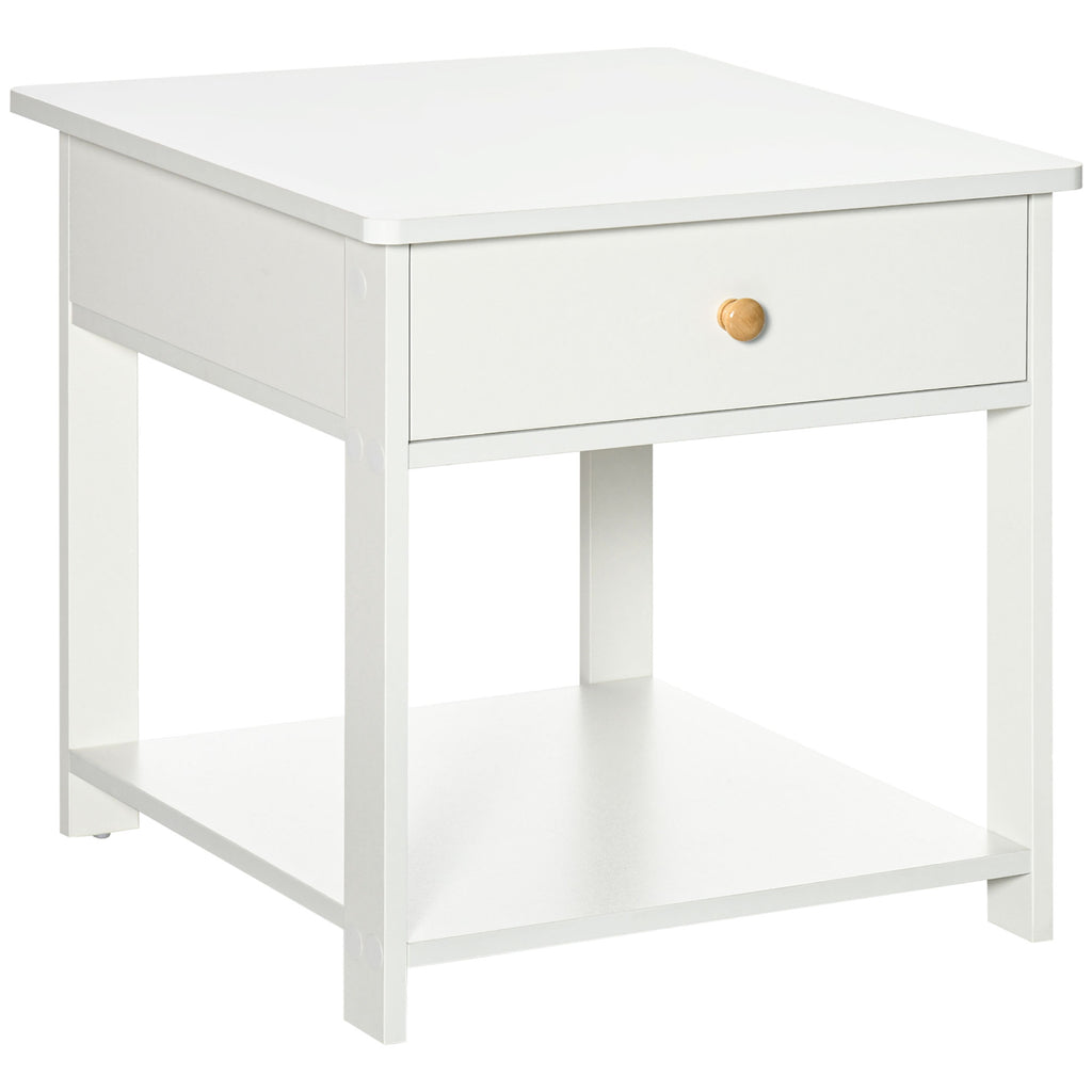 Effortlessly bring extra storage in your bedroom and beyond - do it with this HOMCOM piece. A clean white design for a contemporary look, made from particle board for sturdiness. It comes with a top drawer for discreet storage of smaller items, with an open bottom shelf, which allows open holding space of larger items. Use the flat top for a light and alarm clock. Not just for the bedroom, use this all over the home too.