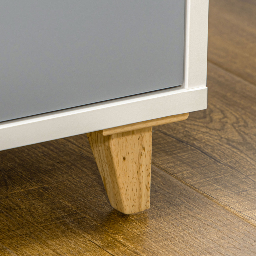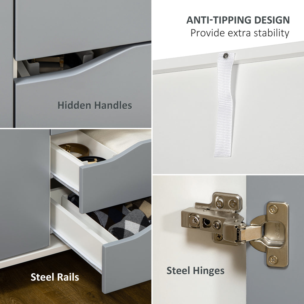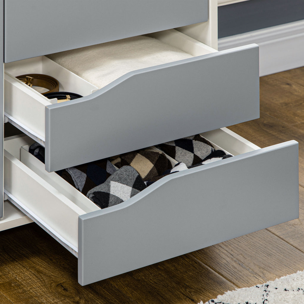 A clothes wardrobe which does so much more - look to this HOMCOM piece. The double size comes with a top inner shelf, two small bottom drawers and a small bottom shelf - room for hanging clothes, folded garments and organising extra accessories. It comes in a mid-grey tone design, with a white body, for a subtly striking look which gently complements other furniture. Complete with supportive wooden legs and safe anti-tipping straps.