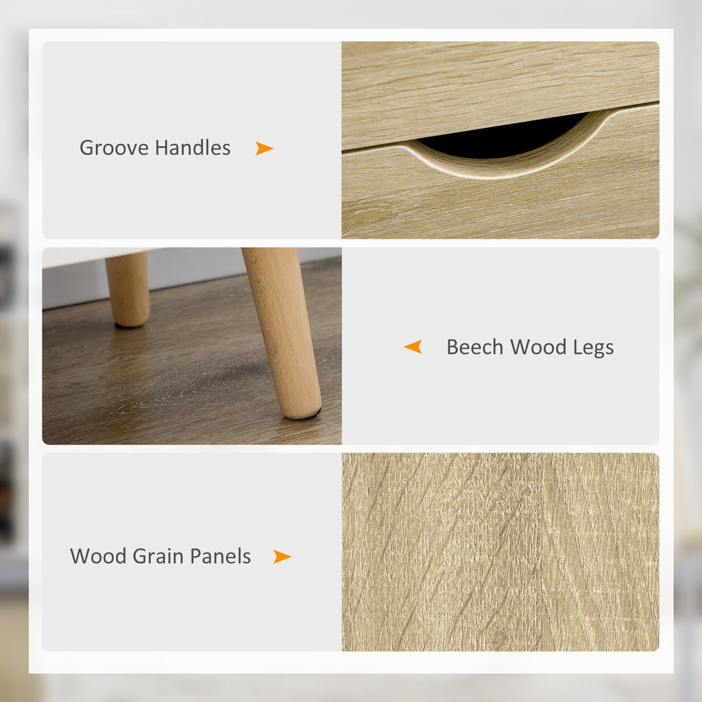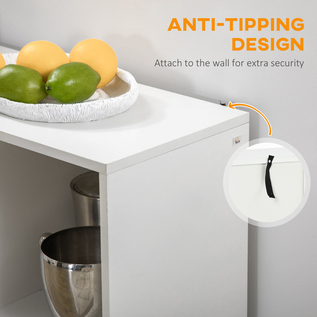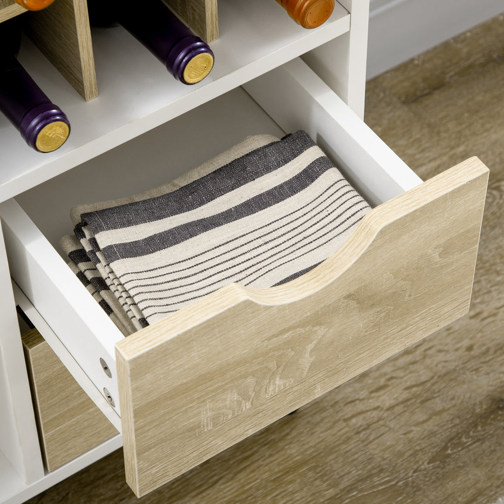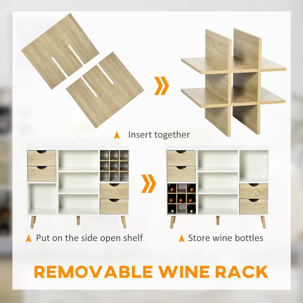 Quickly add that needed storage and get kitchen supplies clutter-free with this HOMCOM kitchen sideboard. With four drawers and open shelves, the buffet sideboard provides a versatile storage solution. Kindly, four interlocking boards are also provided to prepare storage space for your wine bottles. It's made from particle board and beech wood legs, so it's durable and sturdy, with anti-tipping straps included to attach it securely to the wall.