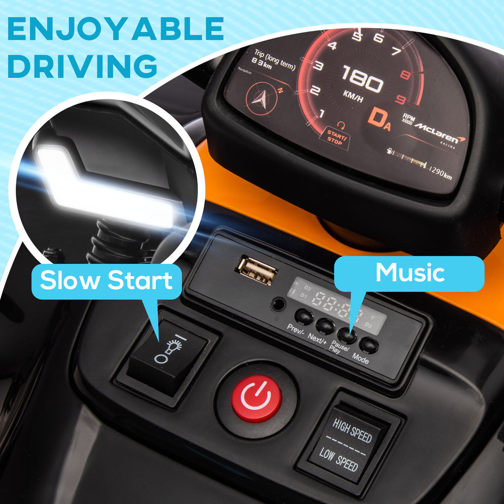 Show your child real excitement and adventure. This HOMCOM electric ride-on will rock their world - imaginations will run wild. An officially licensed McLaren MCL 35 Liveries, this sporty quadbike includes LED headlights to keep safe and visible, whilst the AUX and USB slot lets them enjoy their own music. With a maximum speed of 6km/h, they won't go too fast, whilst the large tyres keep their ride smooth and balanced. Transform their childhood for the better, making it joyous and memorable.