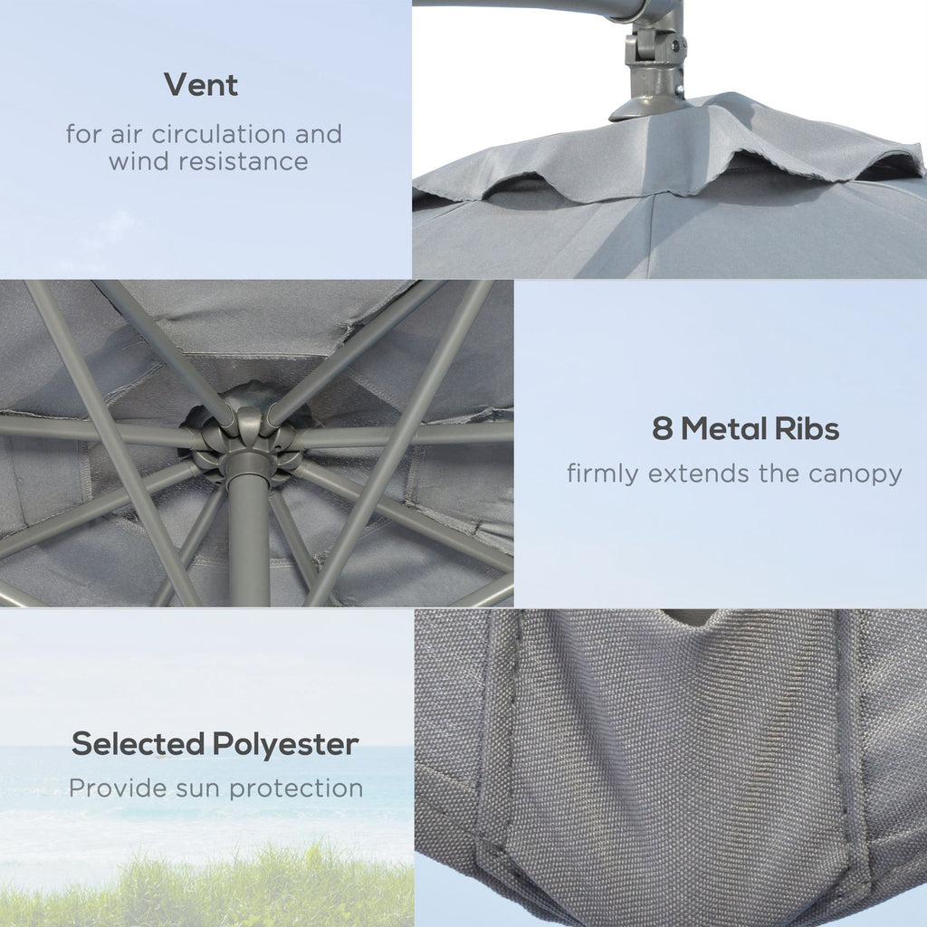 This stylish banana parasol from Outsunny is a superior piece you'll love having outside. The modern overhanging design means you can keep shaded anywhere, bringing shade to large tables, sofas, bistro sets, and more. The core structure is made from metal, so it's tough and sturdy, connecting to the canopy with six ribs for extra support. The canopy is thick to protect you from any sun and light rain, and it features a top vent - letting air pass through with the risk of it overturning.