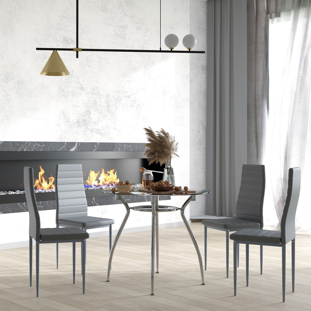 This Dining Set is a great piece of furniture to have in your home, It adds elegance and sophistication to any dining room. The set consists of 4 chairs and a table, the chairs are made from a metal frame and is covered with PVC for the seating and backrest. The table also has a metal frame with a glass top. This is an ideal set for any family home which will match any room decor.