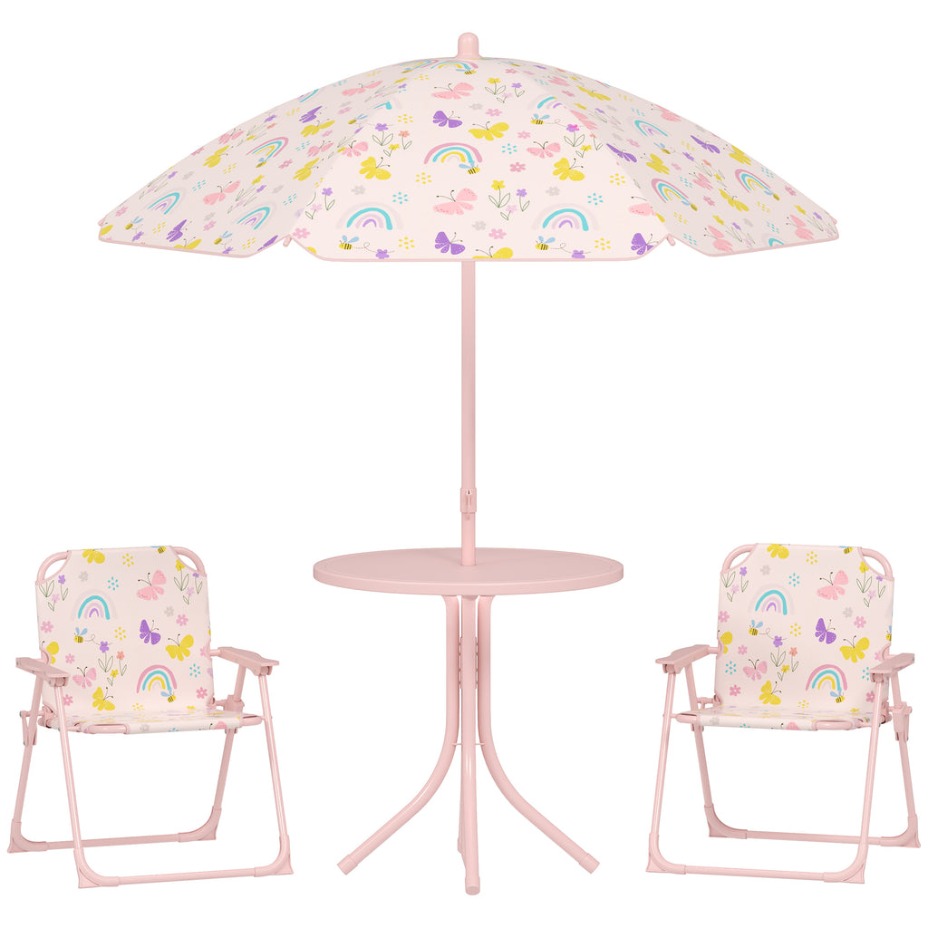 Transform your garden into a whimsical playground with AIYAPLAY kid's folding table and chairs set, featuring a cute rainbow design. This four-piece set includes two kids folding chairs and a table with a central hole for the adjustable parasol, offering shade on sunny days. Suitable for children aged 2-5, the entire set easily folds away for convenient storage.• Four-piece set, includes chairs, table and parasol