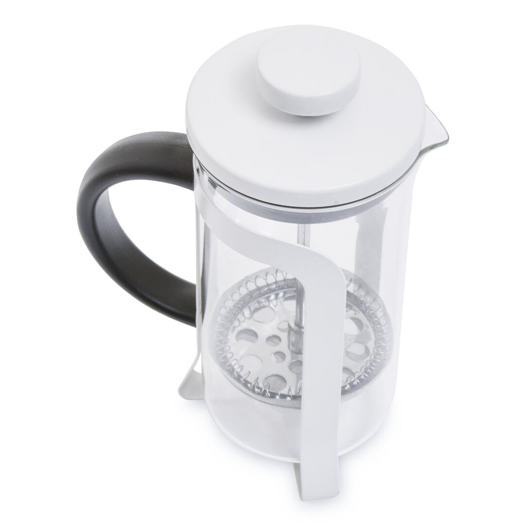 The frame of this cafeteria is made from sturdy stainless steel in a matte white finish, matched with a round lid and plunger. The heat resistant borosilicate glass, supplied with an ergonomic handle, prevents hot drinks from burning hands.
