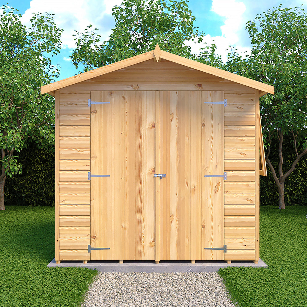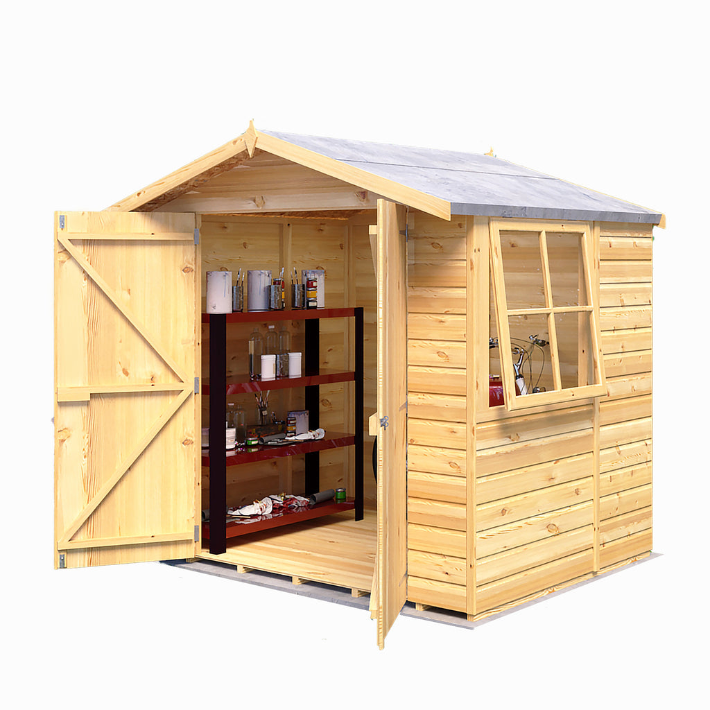 A popular garden shed which is manufactured from high grade, FSC approved timber with 12mm shiplap tongue and groove cladding over sturdy 34mm square framing. With one opening, glass window that can go either side. T&G floor with OSB roof and pad bolt supplied for the door. Dipped base coat preservative ready for you to top coat.