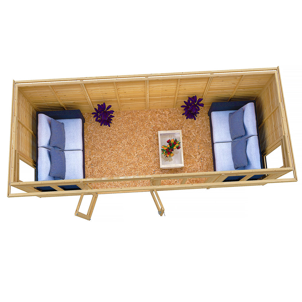 The stylish Alora Summerhouse is a wonderful addition to enhance your outdoor living. Features double doors to the front giving excellent access for furniture. This lovely pent roof garden room is constructed from high grade overlap cladding to the walls over 34mm strong framing with OSB floor and roof. Completed with acrylic safety glazing throughout. Dipped base coat preservative ready for you to top coat.