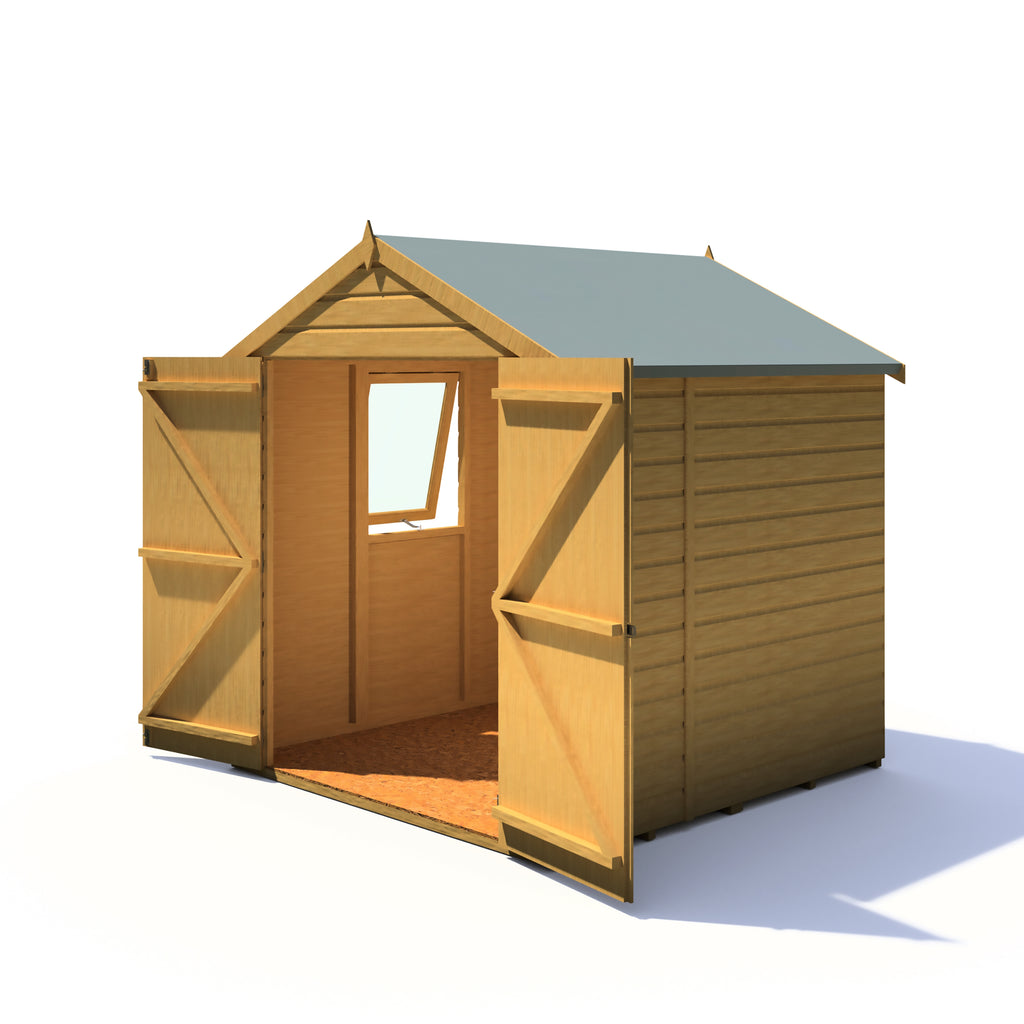 A popular garden shed which is manufactured from high grade, FSC approved timber with 12mm shiplap tongue and groove cladding over sturdy 34mm square framing with OSB roof and floor. With one opening, glass window that can go either side and a double door for easy access. Door comes with hasp & staple ready for your own padlock. Dipped base coat preservative ready for you to top coat.