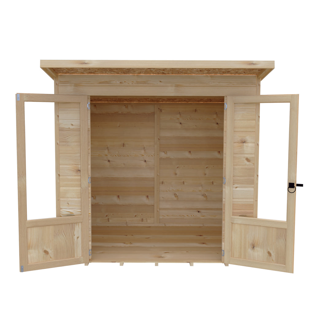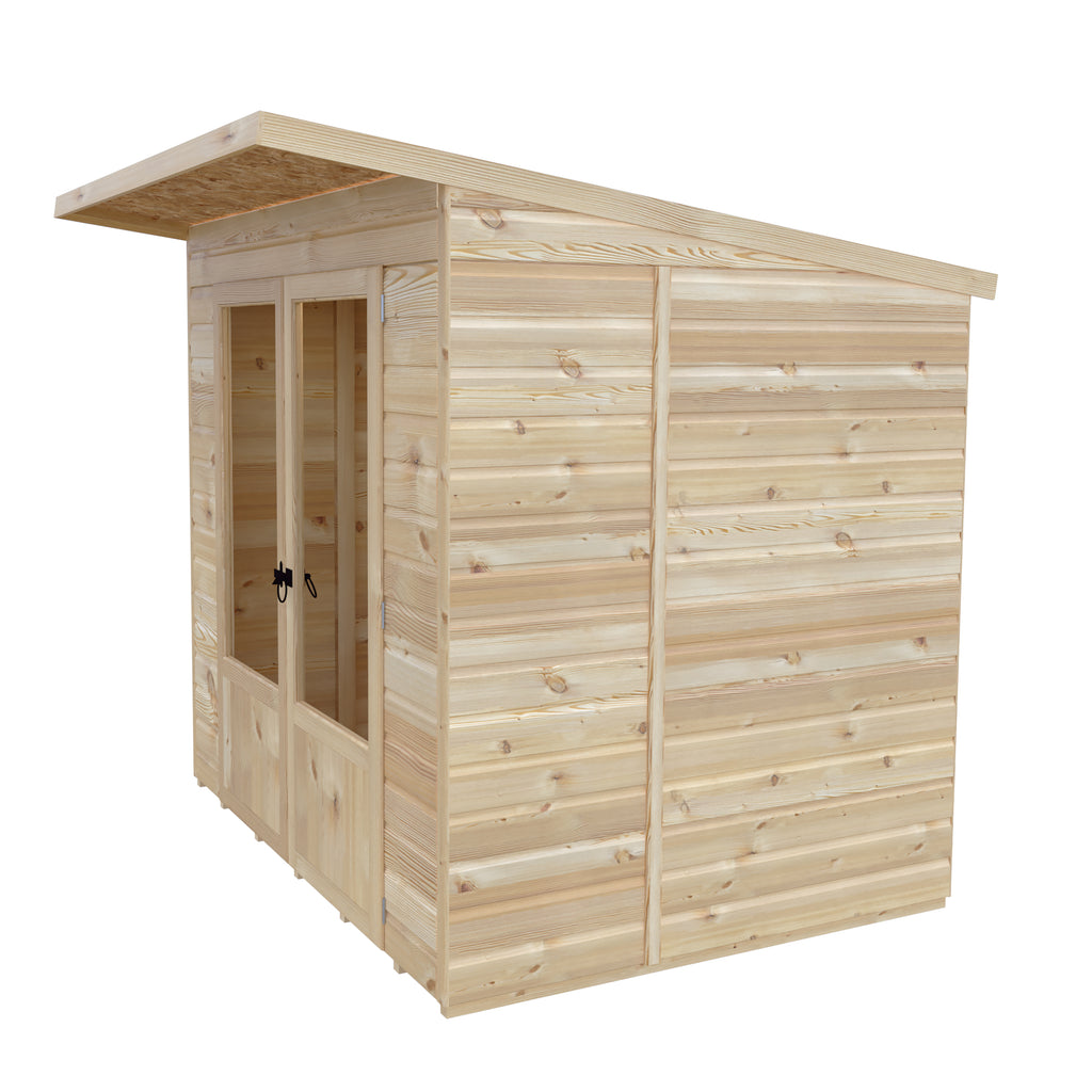 The Avance Pent is an extremely popular summerhouse due to its styling and great price. The joinery quality, acylic glazed doors and large canopy make an attractive addition to any garden or patio. It is constructed on sturdy 34mm square framing and clad with planed Shiplap tongue and groove boards made only from the highest grade, FSC approved, slow grown northern European pine. OSB roof and T&G floor with traditional gate latch to the double doors. Dipped base coat preservative ready for you to top coat.