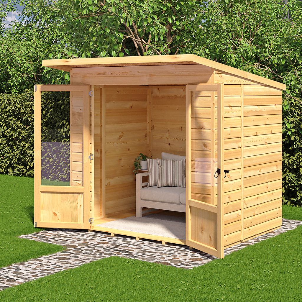The Avance is an extremely popular summerhouse due to its styling and great price. The joinery quality, acylic glazed doors and large canopy make an attractive addition to any garden or patio. It is constructed on sturdy 34mm square framing and clad with planed Shiplap tongue and groove boards made only from the highest grade, FSC approved, slow grown northern European pine. OSB roof and T&G floor with traditional gate latch to the double doors. Dipped base coat preservative ready for you to top coat.