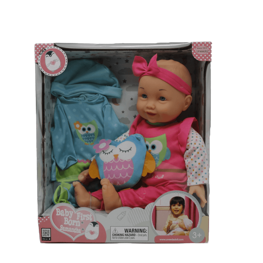 Baby First Born Samantha is a cute and realistic looking doll, it is perfect for pretend and creative play for children. The beautiful doll comes with a toy owl and two matching outfits made from soft materials and is ideal for cuddling. She loves to be taken care of and cuddled, just like a real baby!