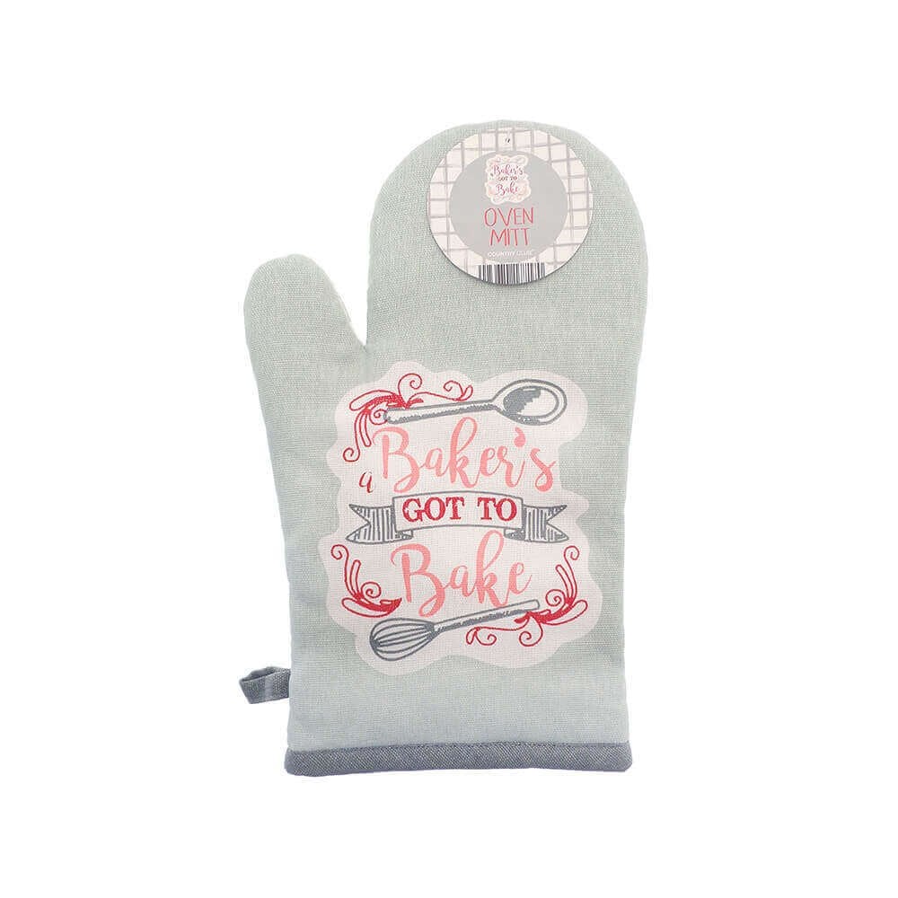 p>This oven mitt features an adorable baking design with a grey background. It the perfect accessory to your kitchen and this glove has a soft inner that is comfortable to wear and is thick enough to protect your hands from removing baked treats from the oven.