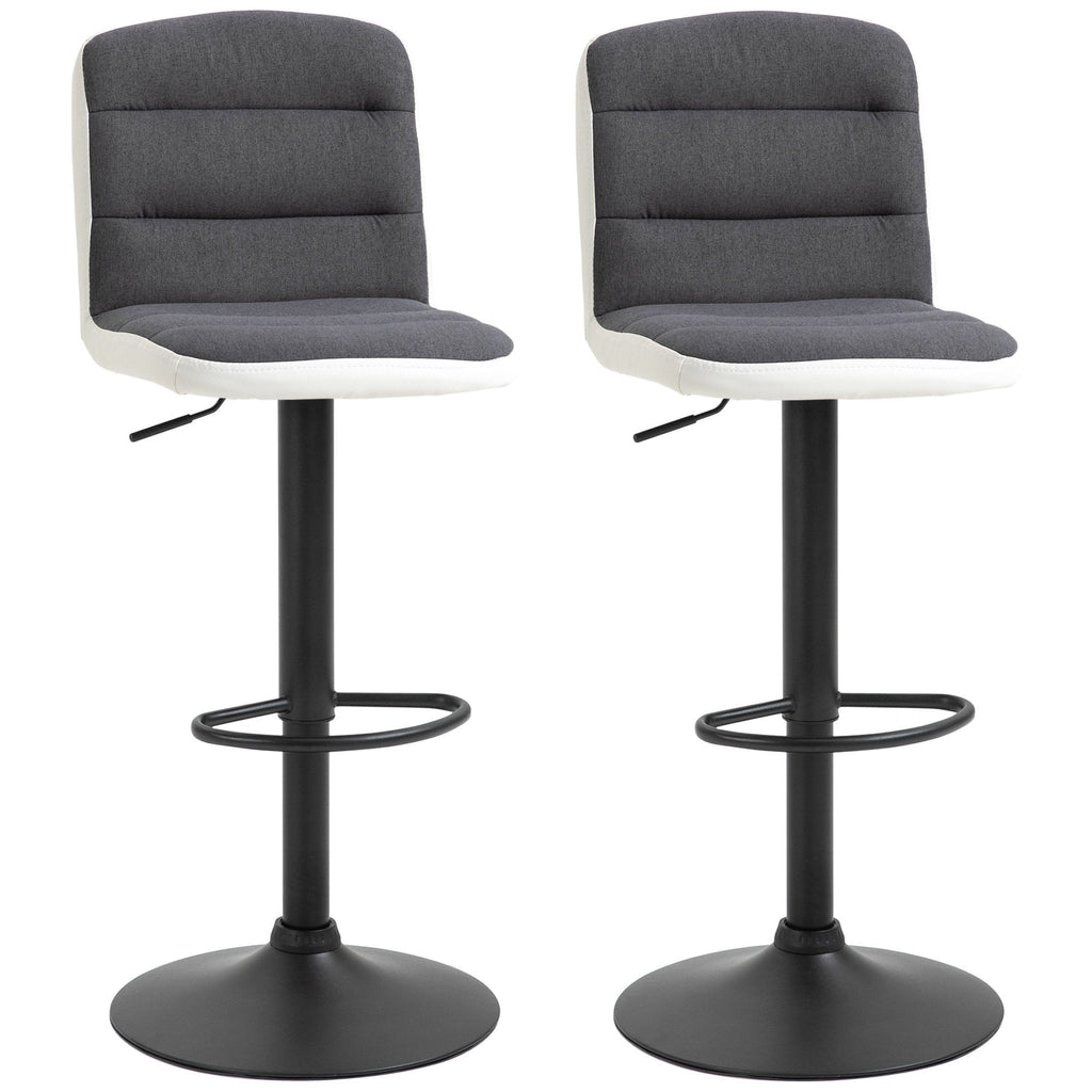 Accent your kitchen counter or seat a guest with this bar stool set. The mid-size back and footrest provides high seating comfort, while the seat height is adjustable to suit different statures. PU leather and linen-touch polyester fabric mix add textual interest.