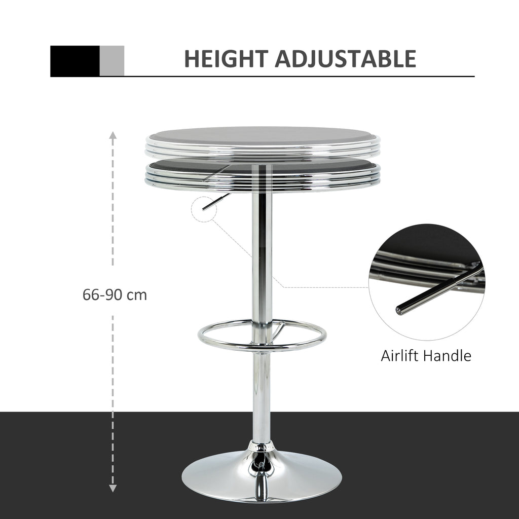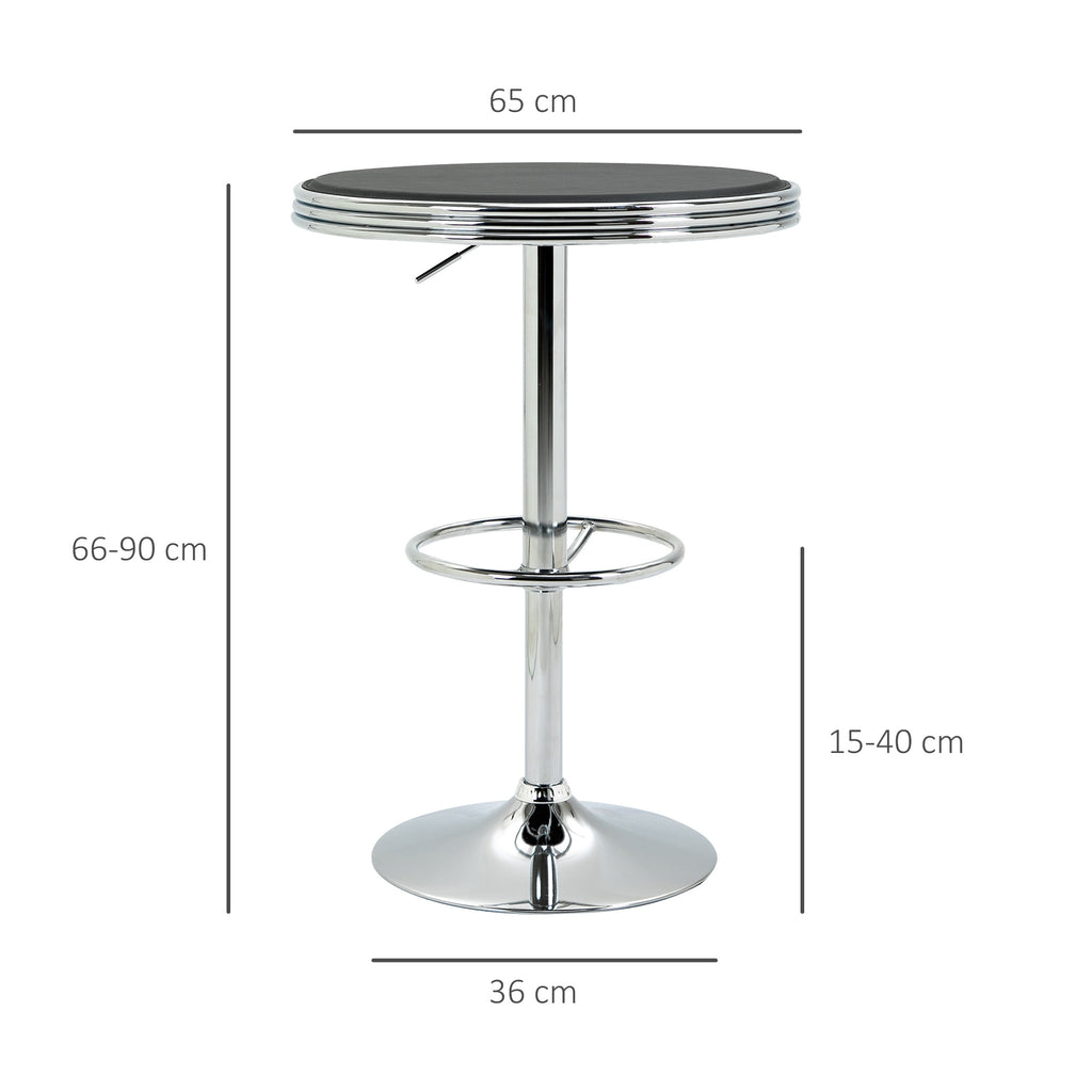 Style which stands the test of time: this HOMCOM poseur bar table pairs perfectly with stand-up drinking or high chairs. Steel frame with a large round base on the bottom and includes anti-slip pad to keep it balanced. The top of this kitchen table is formed of the ribbed edges and faux leather, creating a mix of executive style and cool texture.As well being able to conveniently adjust the height, it also features an adjustable footrest to set to a level most comfortable for resting the feet.