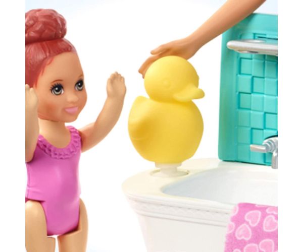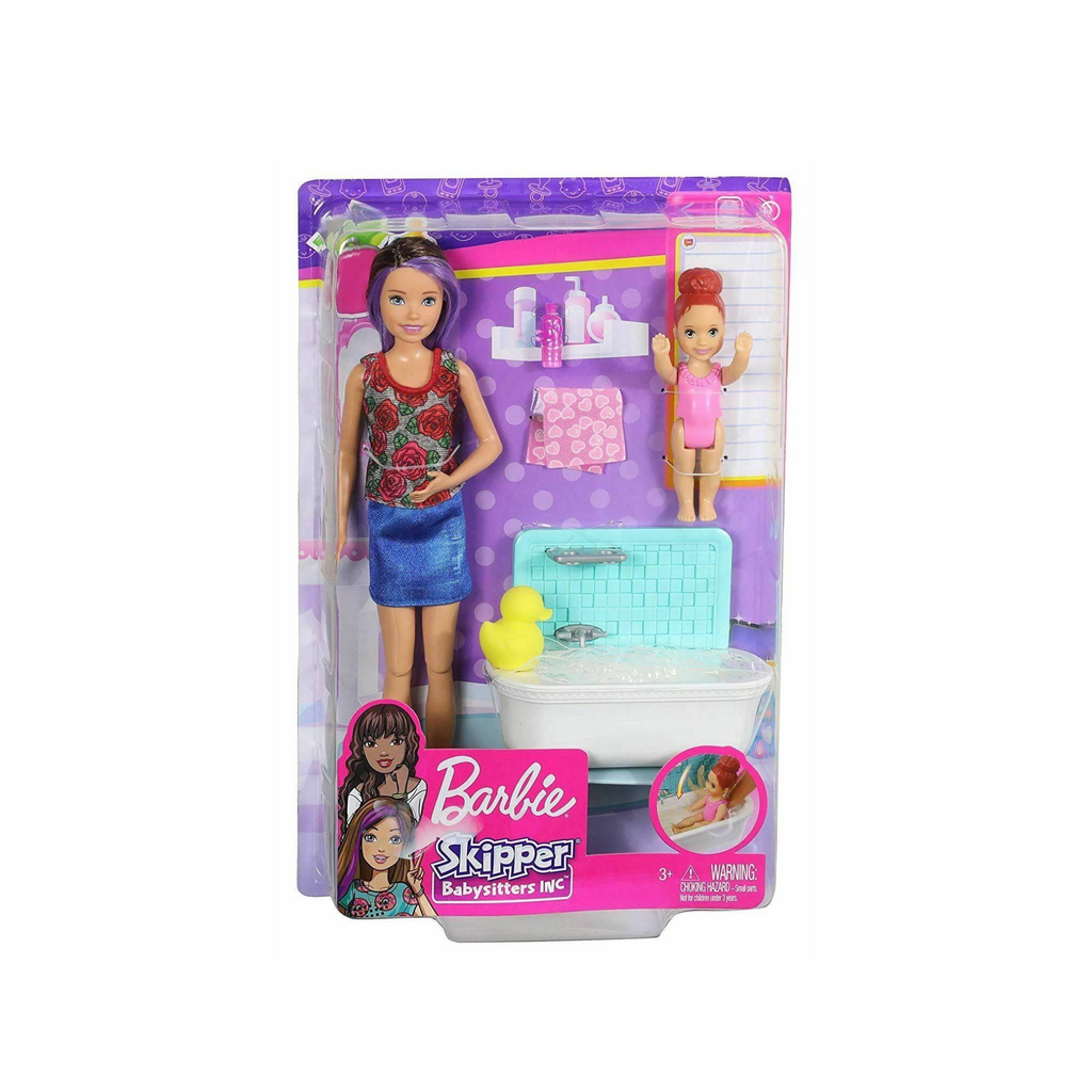 The Barbie Skipper Babysitters Inc. Play set allows children to recreate babysitter moments. The set stimulates caring role play and includes a Skipper Babysitter doll, a toddler doll and accessories suitable for the bathroom, including a white bath and a blue tile mirror