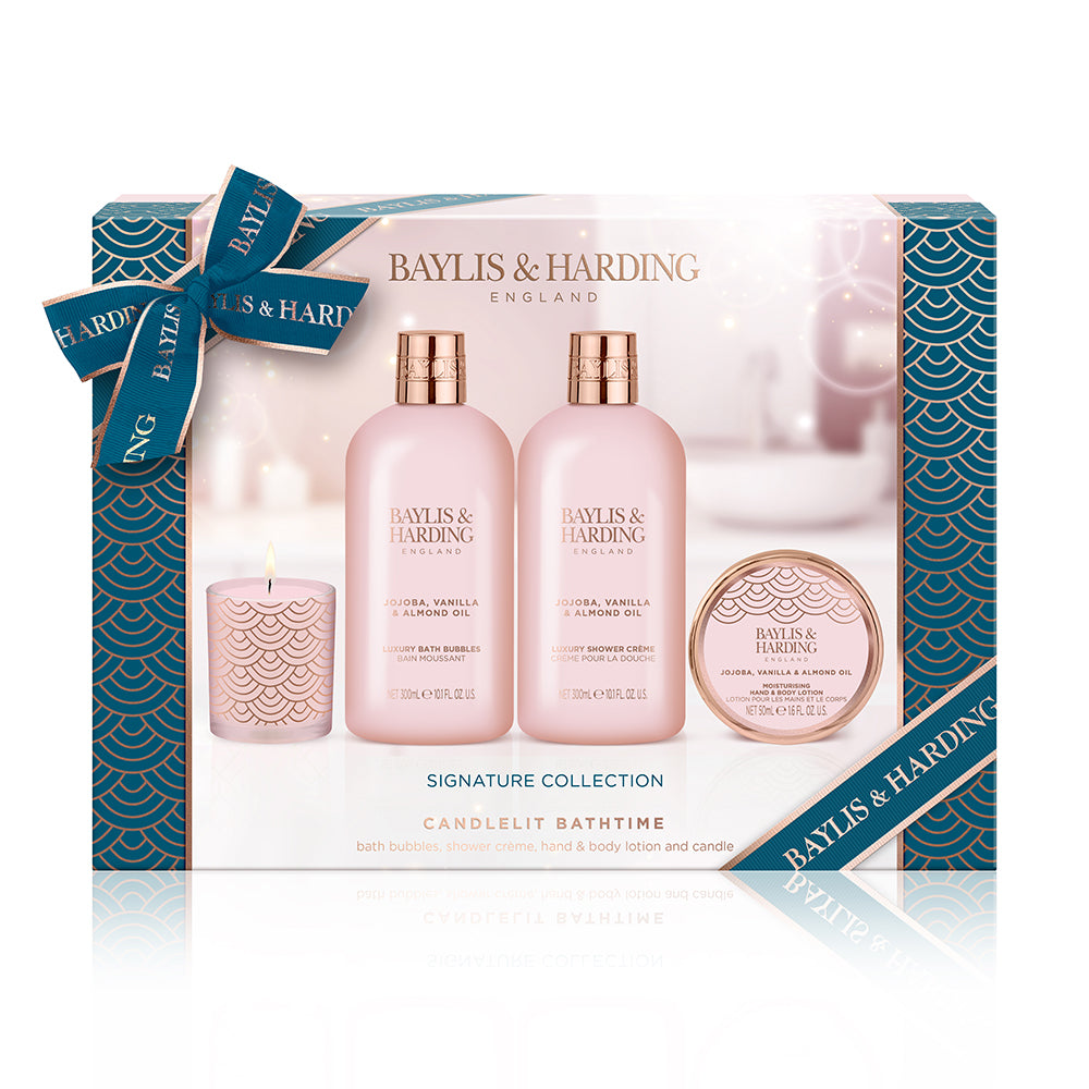 Baylis & Harding Jojoba, Vanilla & Almond Oil Candle Set, Containing: 300ml Bottle Bath Bubbles, 300ml Bottle Shower Creme, 50ml Jar Hand & Body Lotion and 60g Scented Candle