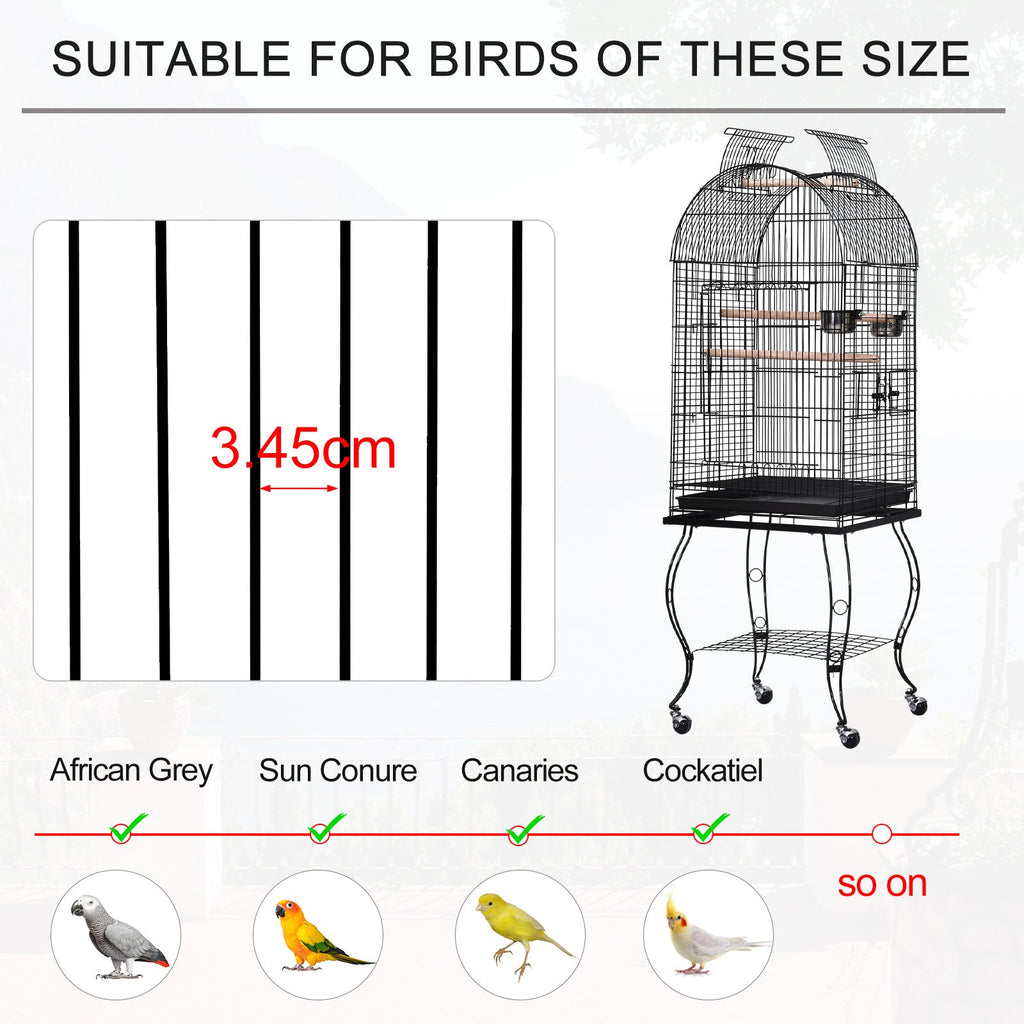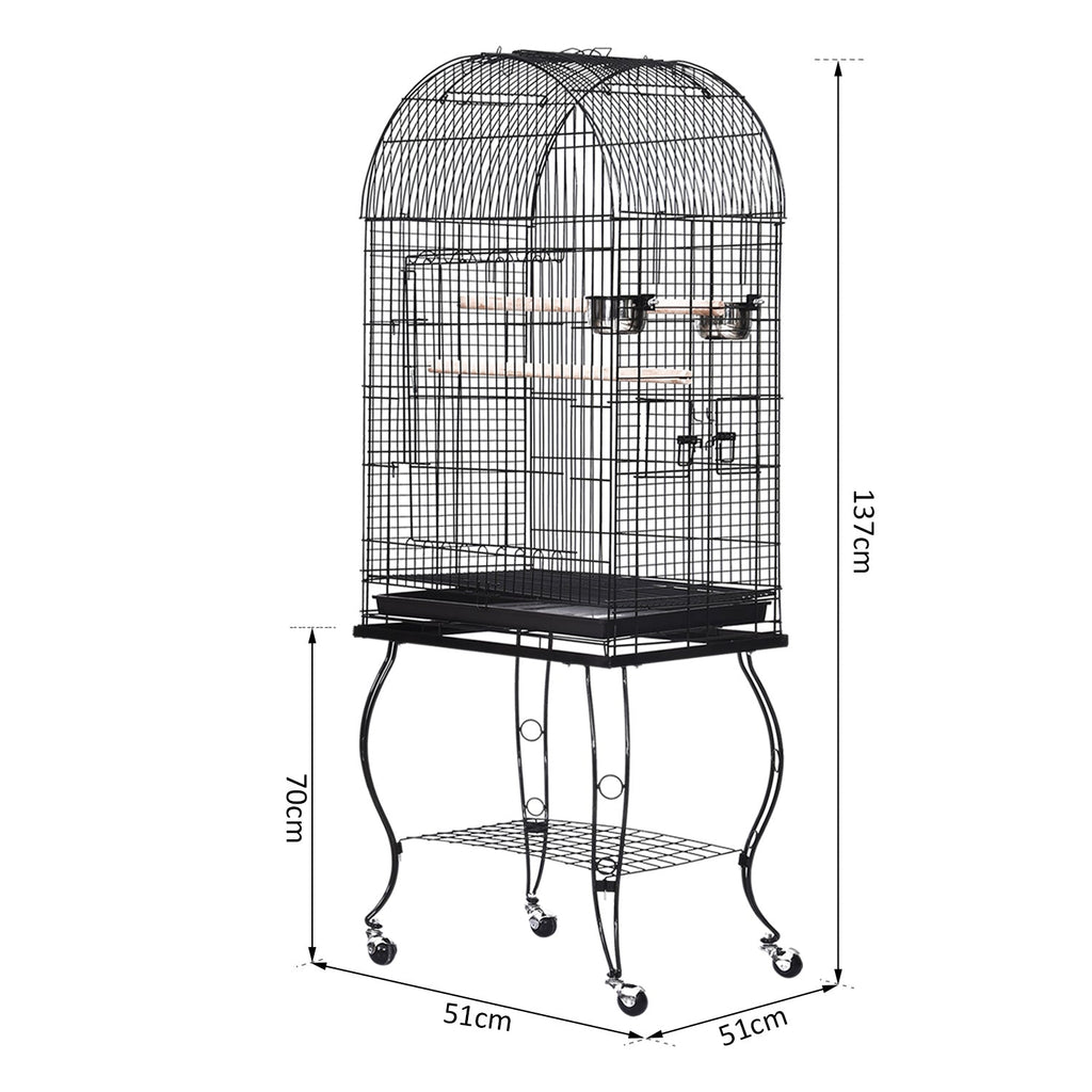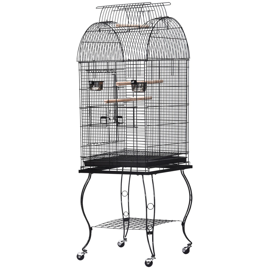A fun and secure interactive cage for your pet, such as finch, parrot, cockatiel, conure, canary, macaw, parakeet and others can benefit from the physical and mental stimulation provided by an enclosure that provides plenty of living space and room for activity. This cage is constructed in high quality metal wire, steel tube, PS and wood. It comes with 2 feeding bowls for food and water and has 3 doors--1 on the top and 2 on the either side, and 2 wooden perches for the birds to sit on. The cage can sit on the trolley which comes with a shelf for placing items, and with the wheels, it can be easily moved around. Excellent manufacturing quality for long lasting use.