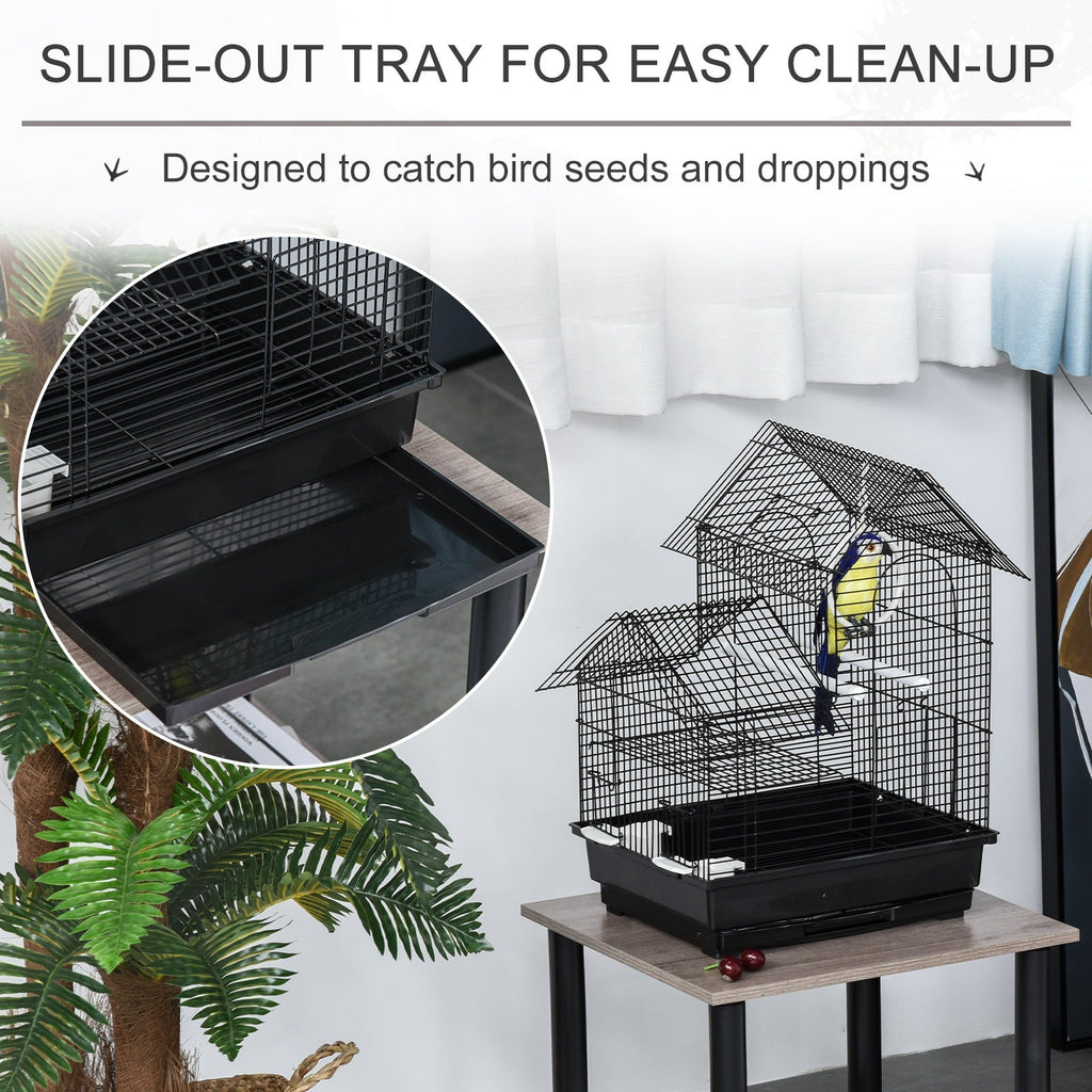 Keep your pet stimulated, safe, and happy with an indoor bird cage from PawHut that promotes well-being and longevity for your feathered friends. Our cage provides plenty of living space and pull-out tray for bird droppings. This bird cage includes 2 plastic perches, 2 plastic food containers and 1 plastic swing ring for your birds to enjoy. Keep them safe, keep them secure, but also keep them happy, active, and occupied for a long life worth living. Just come and buy one for them!