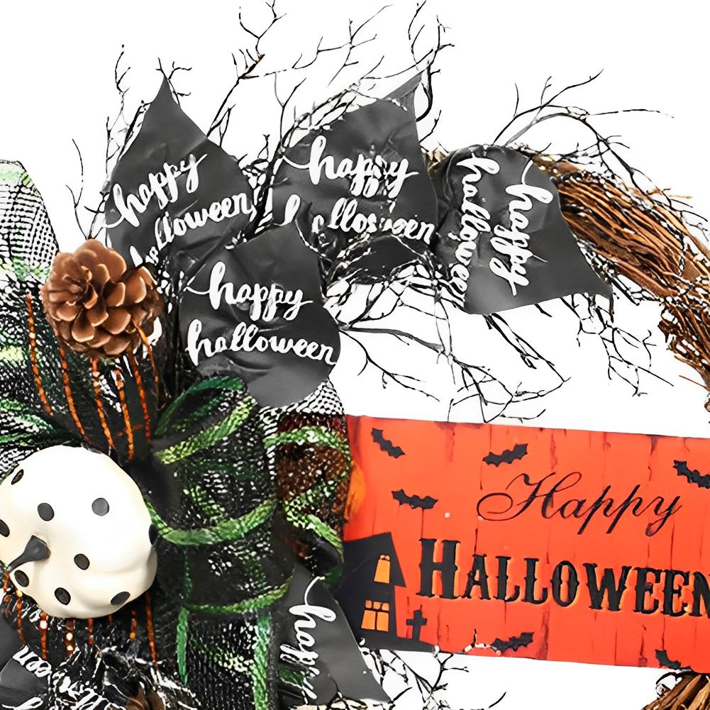 Add wonderful Halloween vibes to your home with this wreath. It is crafted from durable silk and plastic to ensure long-lasting decoration. Elaborately accented with black bows on half of the wreath, the extending branches create a spooky atmosphere. The included Happy Halloween sign enriches your holiday decor and impresses your guests. Suitable for indoor or covered outdoor use, it also makes an ideal gift for friends and family.