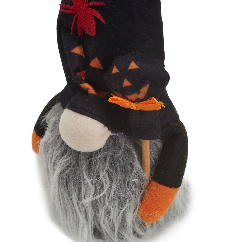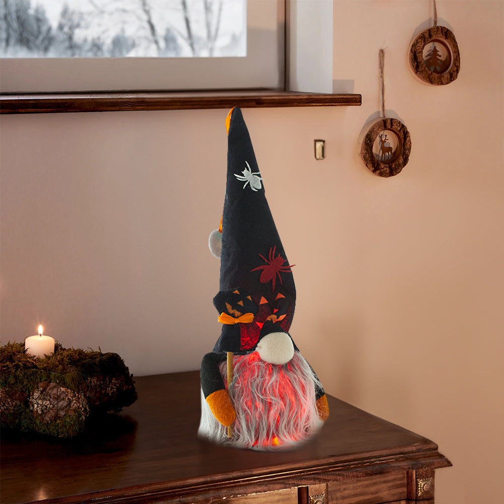 This gnome character adds a spooky touch to your Halloween decor. Featuring a tall witch hat decorated with a spider ornament, it balances eerie and charming perfectly. The faceless gnome has a long beard trailing to the floor and holds a pumpkin cane in one hand. Coloured LED lights illuminate the figure, bringing it to life and enhancing the Halloween atmosphere.