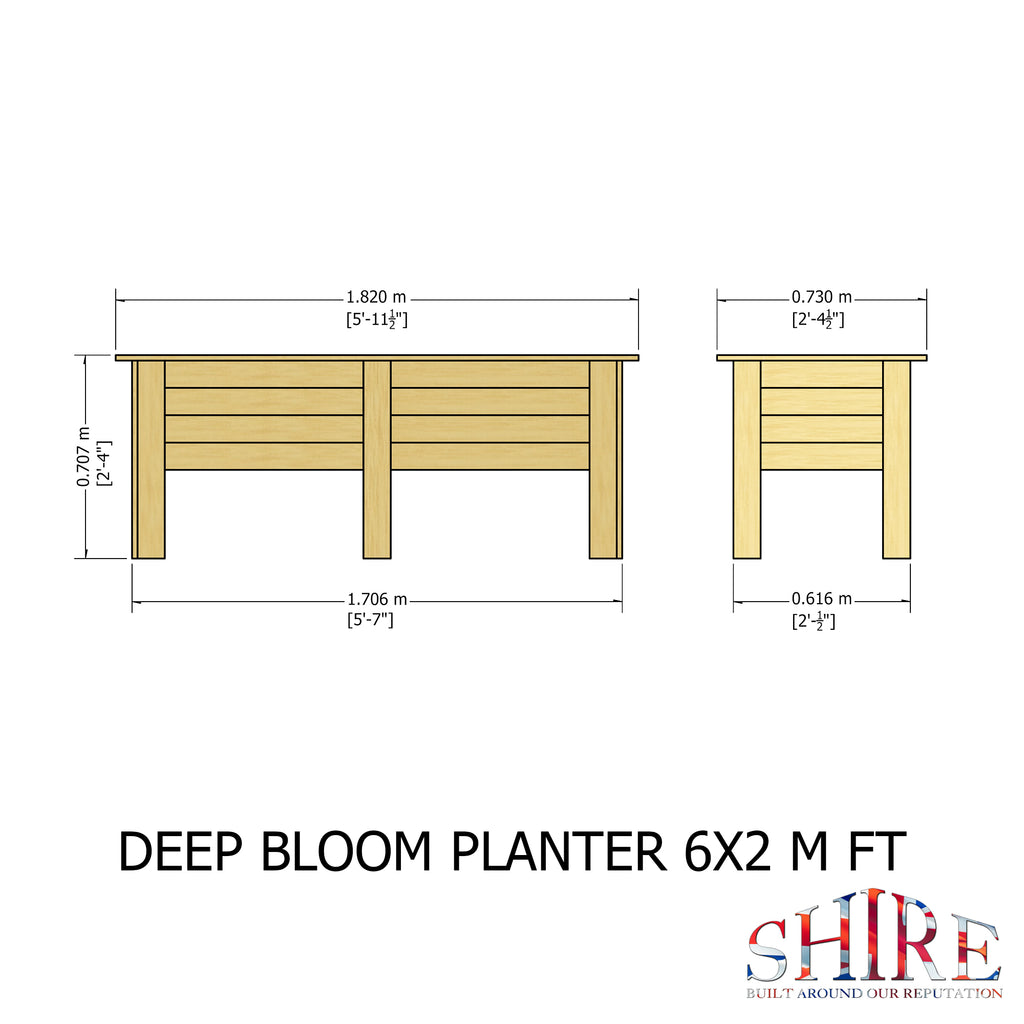 The Shire Bloom deep root planter is made from high-quality pressure-treated timber for durability and resistance to rot and decay for long-lasting use. The Bloom provides good growing space for cultivating deep-rooted vegetables, such as carrots and potatoes, as well as a variety of flowering plants and herbs that thrive in deeper soil. The natural wood finish complements any outdoor decor but can still be painted or stained to suit. The planter is designed for easy assembly, with all necessary panels, fixtures and fittings included, allowing gardeners to easily set it up and start planting.