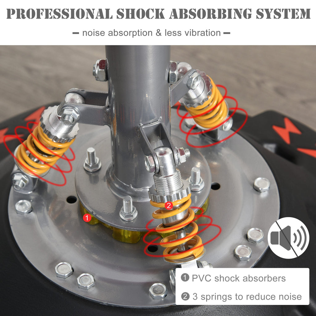 Strike lucky with this freestanding boxing punch bag from HOMCOM. It is fitted with three powerful shock absorption springs, which allows the bag to spring back into place, everytime - giving you an effective and full work out. The bag is firm yet won't harm you for safety. A large base keeps the balance when in use, with 12 suction cups to keep in place on the ground. The base can also be filled with water or sand, making it heavy when full and easy to carry around when empty. It's finished with a cool red and black symbol design all over.