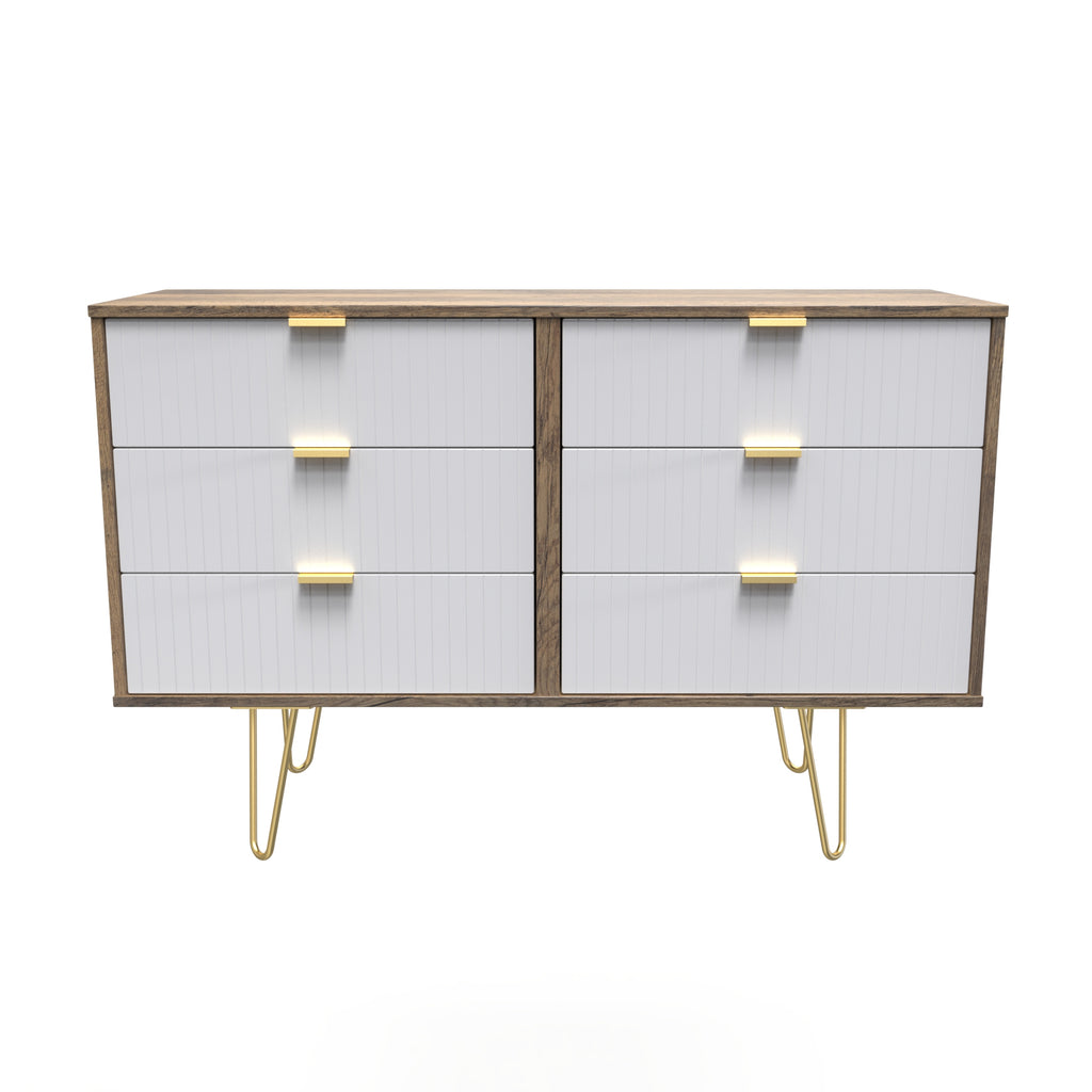 (Dimensions: H76 x W115 x D40cm) This double width 6 drawer chest of drawers is practical and stylish. Perfect for any home as a free standing storage unit. A modern and distinctive range. Named for the unique "Linear" patten of the drawer and door fronts. Also features Gold Metal Handles and Gold Hairpin Legs. Comes in a wide range of colours including eye cathching two tone colour combinations. All our furniture is made in the United Kingdom, to the highest quality. It is delivered direct to your location of choice by one of our two man delivery teams, and comes fully assembled (although legs may be removed to prevent damage in transit).