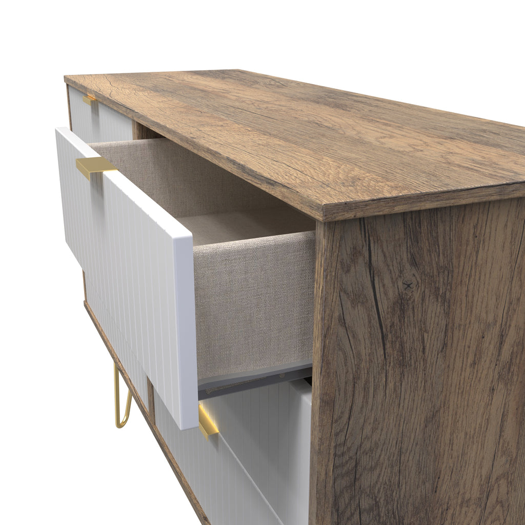 Made in the UK; Scratch Resistant Finish; Ready Assembled; Distictive Linear Design; Gold Metal Pull Handles; Gold Hairpin Legs; Smooth Metal Drawer Runners; Linen Effect Drawer Linings