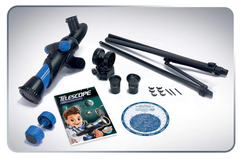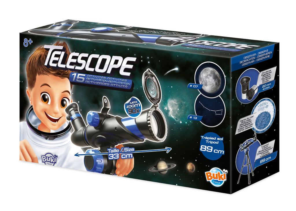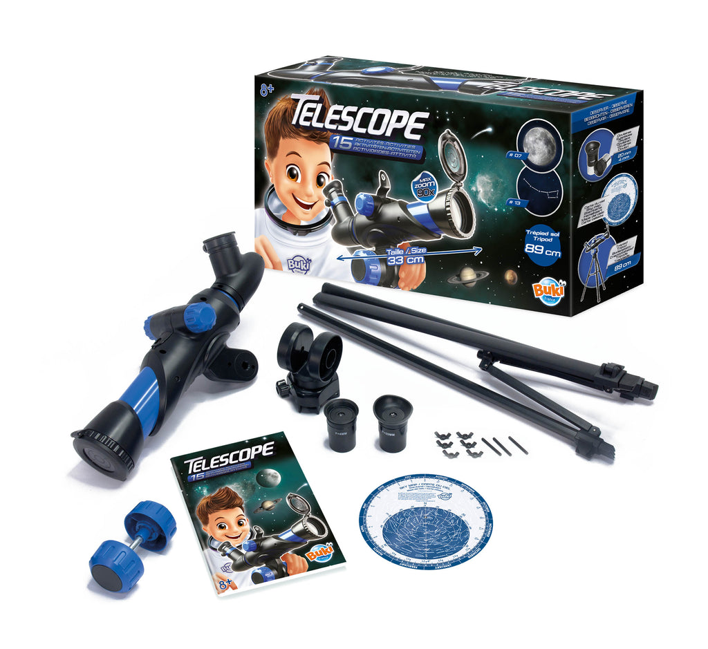 This telescope that comes with a booklet with 15 activities to discover the stars, planets and lunar landscape. The telescope is easy to set up, has glass optical elements and has a lens diameter of 50mm, a focal length of 360mm, a 4mm and a 20mm eyepieces, its possible magnification is 18x and 90x. Comes complete with a 89cm tripod. Suits ages 8 years +.