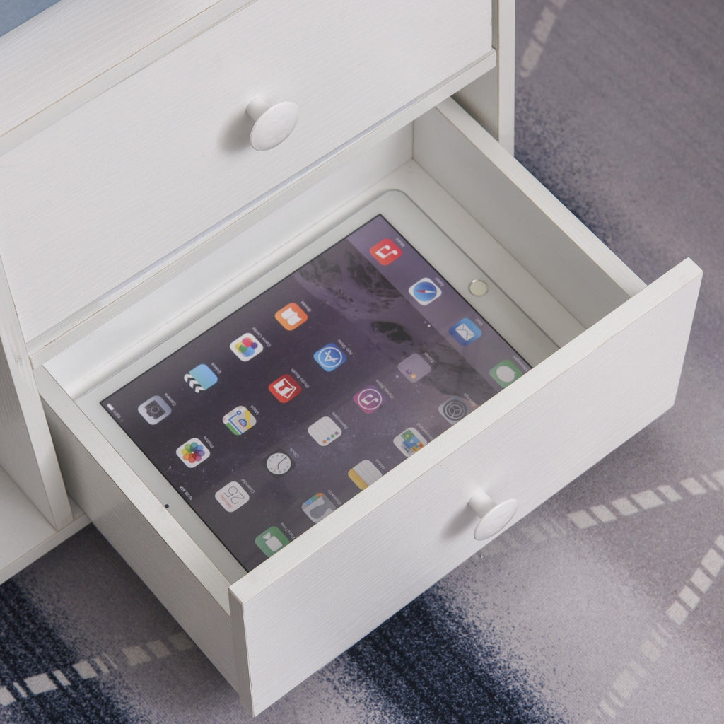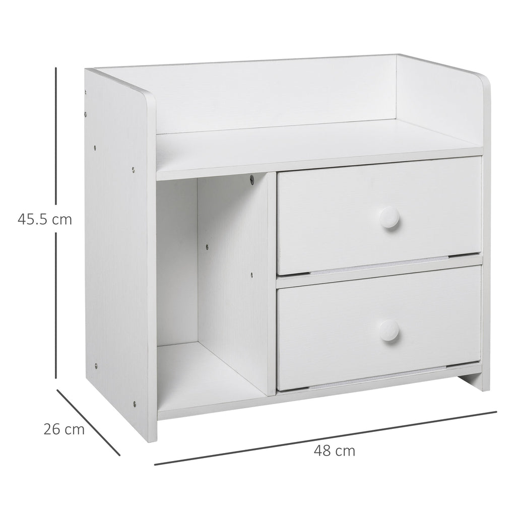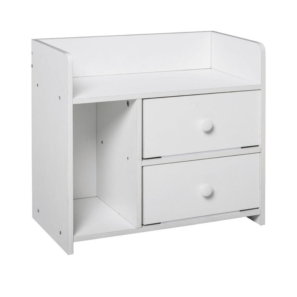 A clean desk equals a clean working mind. Bring this mini organiser from HOMCOM into your home or office to keep your day clutter-free to enhance productivity. Using particle board for the structure, which is durable and strong for long-term use, it is crafted into a space-efficient design: it features two drawers, an open compartment and top shelf, giving you lots of room for keeping books, files, stationery and more organised. Its white colourway and smooth curved shape is modern and beautiful, allowing it to stand anywhere with ease, and it's finished with an oblong base to keep the balance.