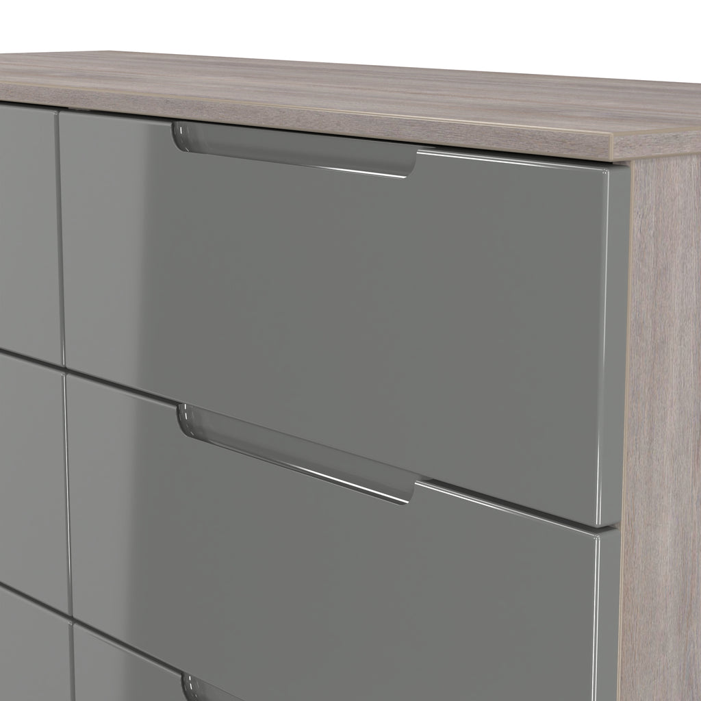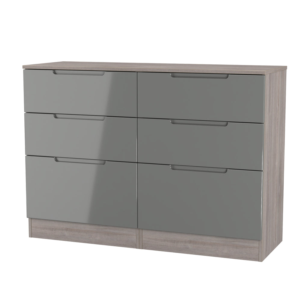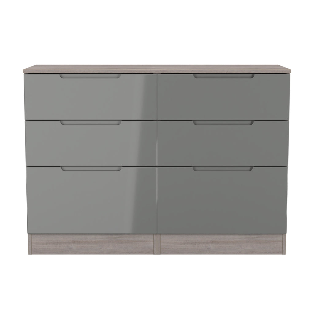 (Dimensions: H80 x W110 x D39cm) This double width 6 drawer chest of drawers is practical and stylish. Perfect for any home as a free standing storage unit. An exciting new range ideal for the modern contemporary home it comes with distictive indented handles, perfect for the 21st century home. All our furniture is made in the United Kingdom, to the highest quality. It is delivered direct to your location of choice by one of our two man delivery teams, and comes fully assembled - Please Note that any handles or legs may be removed durning transit to avoid the risk of damage.
