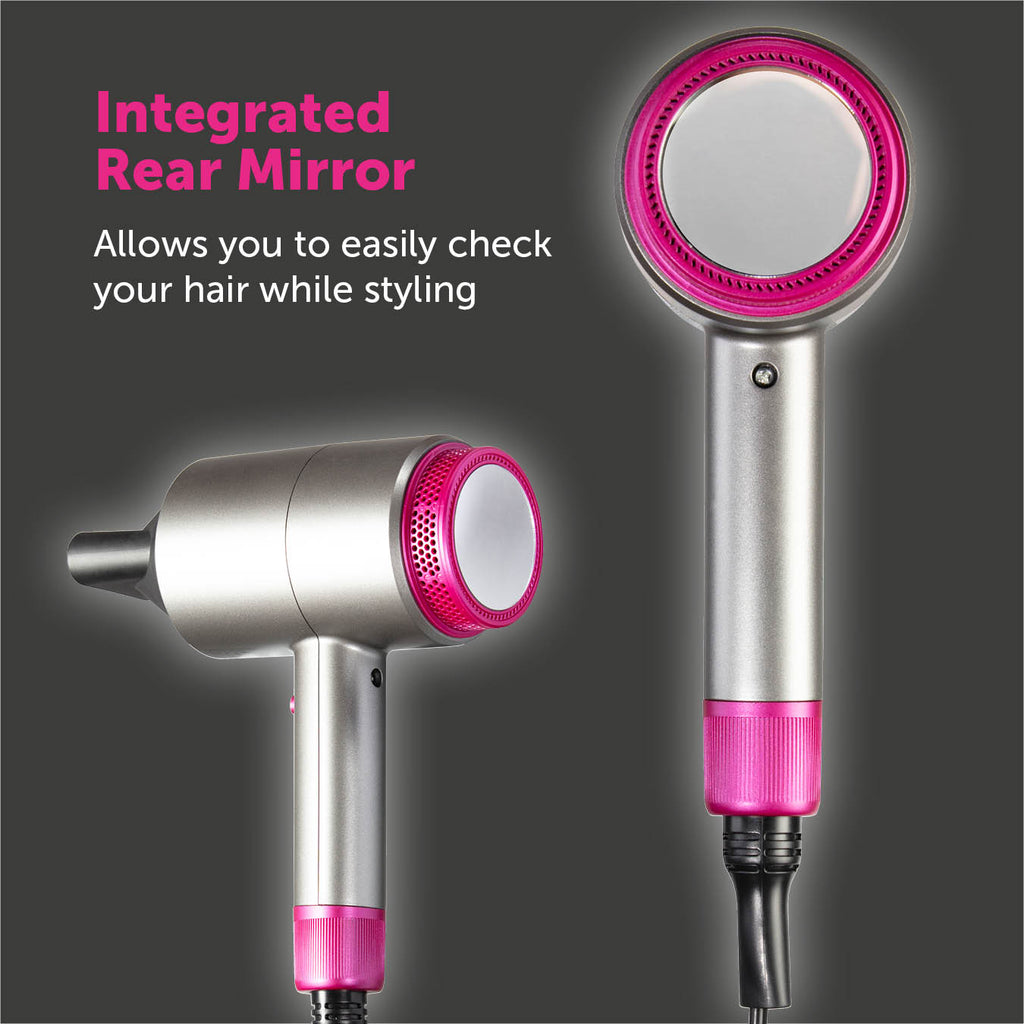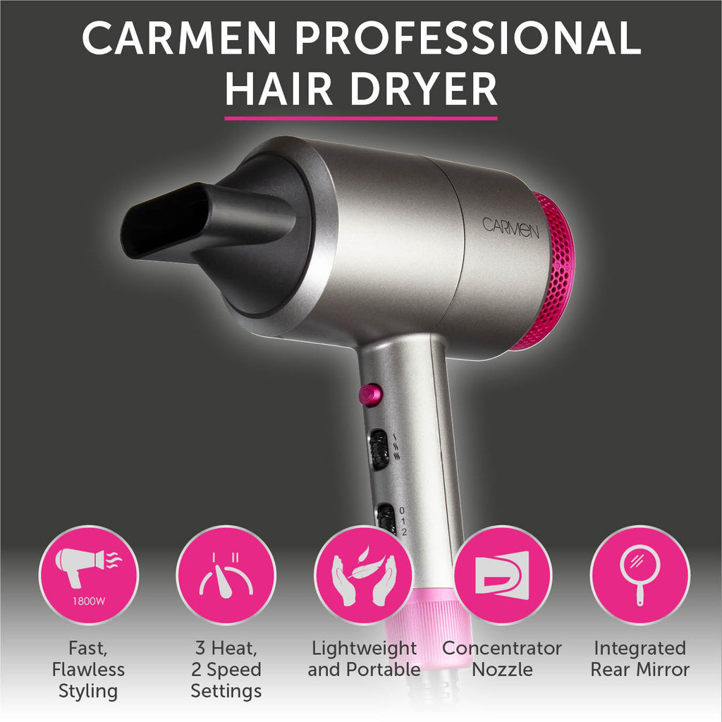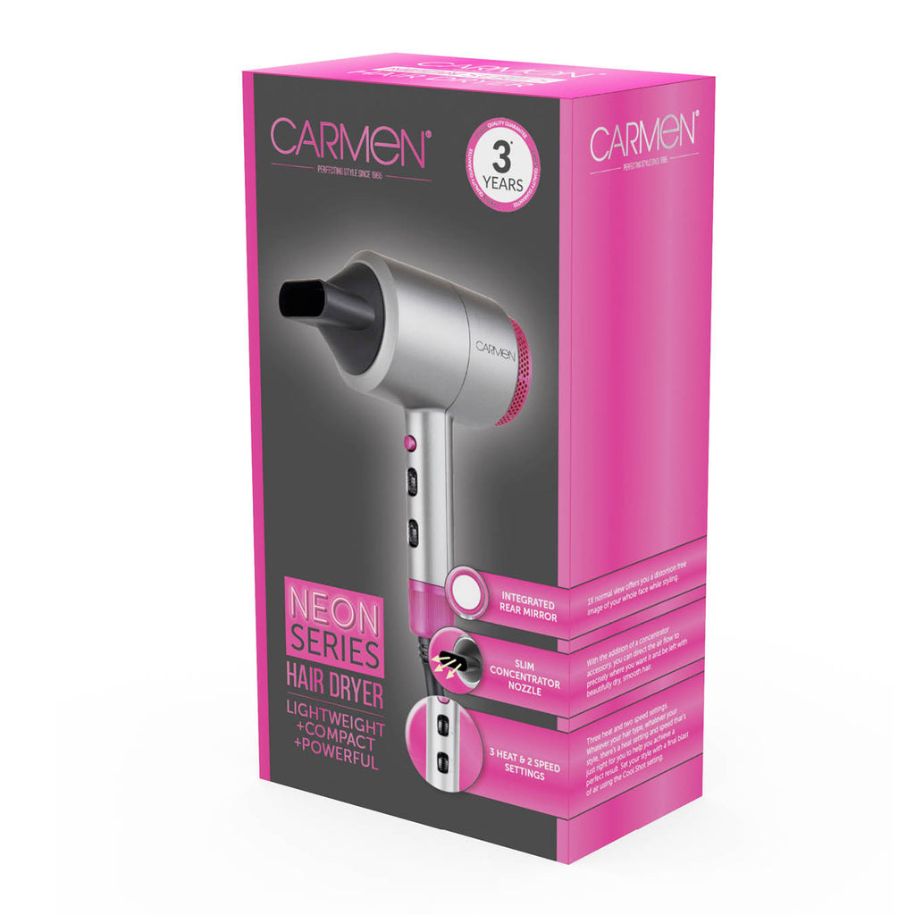 Blow dry your hair with a fast, flawless finish using the powerful Carmen Neon hair dryer. Flaunting a vivid neon pink and lightweight design, the accessory adds style and comfort to your hair-care routine. It features three heat and two speed settings suitable for styling hair of any length or thickness, with a cool temperature setting included to help secure your style in place for a longer-lasting blow dry. The slim concentrator nozzle attachment directs hot air onto sectioned hair to help you create a defined look. A removable filter is included to easily dispose of caught hairs and lint to maintain drying performance. Featuring a rear mirror to check your look at any time, the Carmen Neon dryer is an ideal all-in-one accessory for professionally styling your hair.