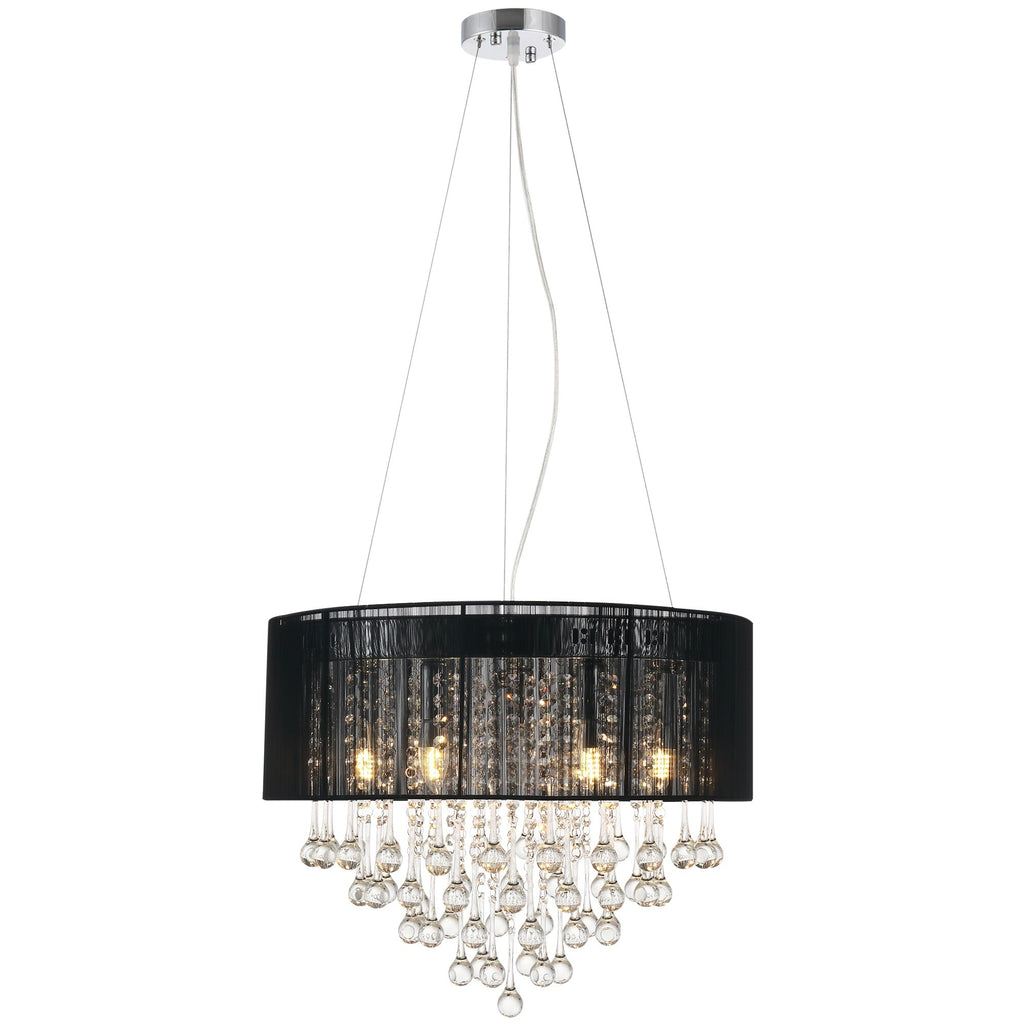 - Comes with large drum shade and hanging chandelier pendant.