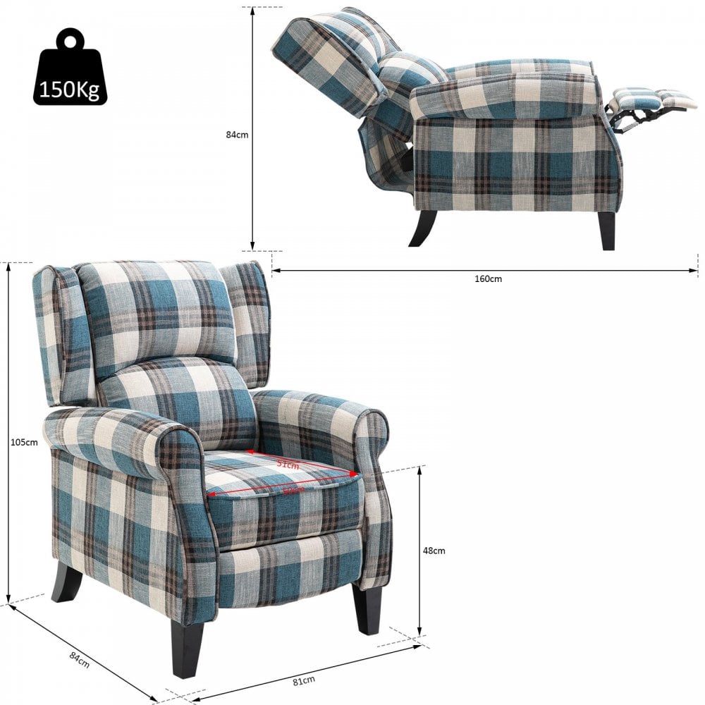 Smart, stylish and oh so comfortable. Invite this recliner chair into your home, and it will soon become a sure-fire winner everyone will be fighting to sit on. Upholstered in linen for easy maintenance, it is covered in a blue, grey and faded white check design which makes it an eye-catching addition to your home. The frame, made from a blend of wood and metal, ensures the chair can support a weight up to 150kg, with the back reclining between 110, 130 or 160 alongside the retractable footrest to allow you to be in control of your comfort. With thick padding all over that you'll love sinking in to, it is finished with four wooden feet with anti-slip pads to prevent any damage to the floor beneath. They say looks can be deceiving, but with this chair, they certainly are not.