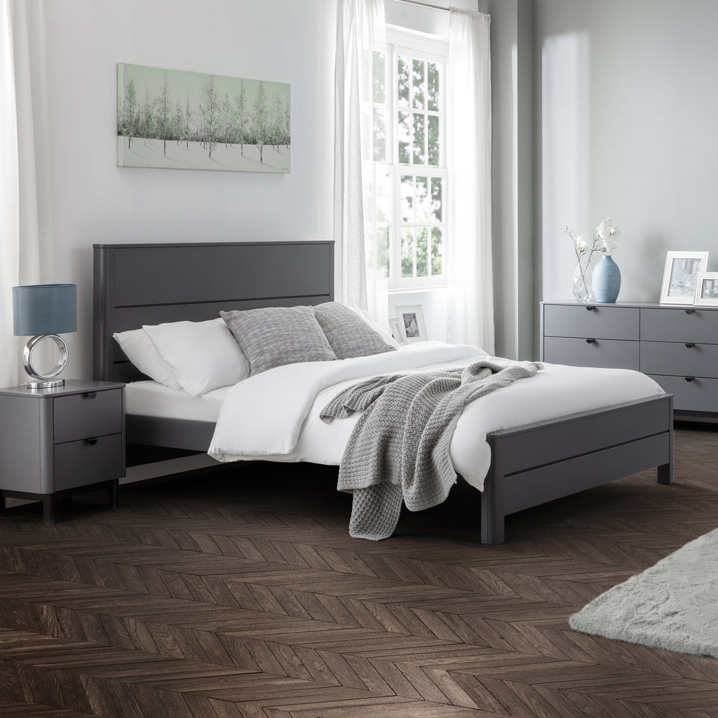 The Chloe Bedroom collection has a modern, retro style finished in a storm grey lacquer. The corners are rounded for a softer look, creating perfect balance between style and functionality. Featuring recessed lines in the headend and footend, the Chloe bed is available in double and king sizes.