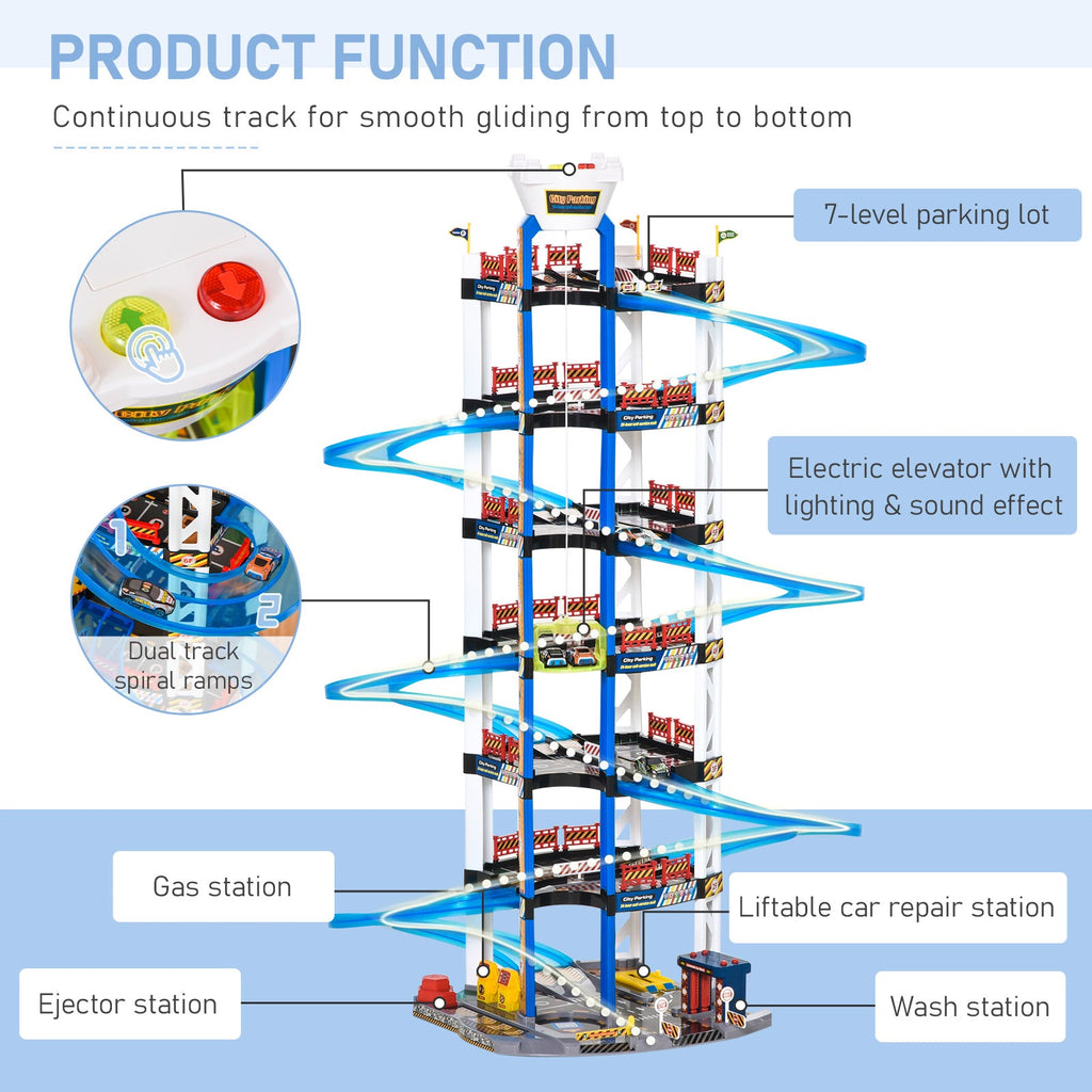 - Item label: 3A0-007 SEVEN LEVELS: Dual ramp design so two cars can move at once, fast spiral shape so they move quick for fast fun. fitted with wash station, repair station, refuel station, ejector station and traffic signs.