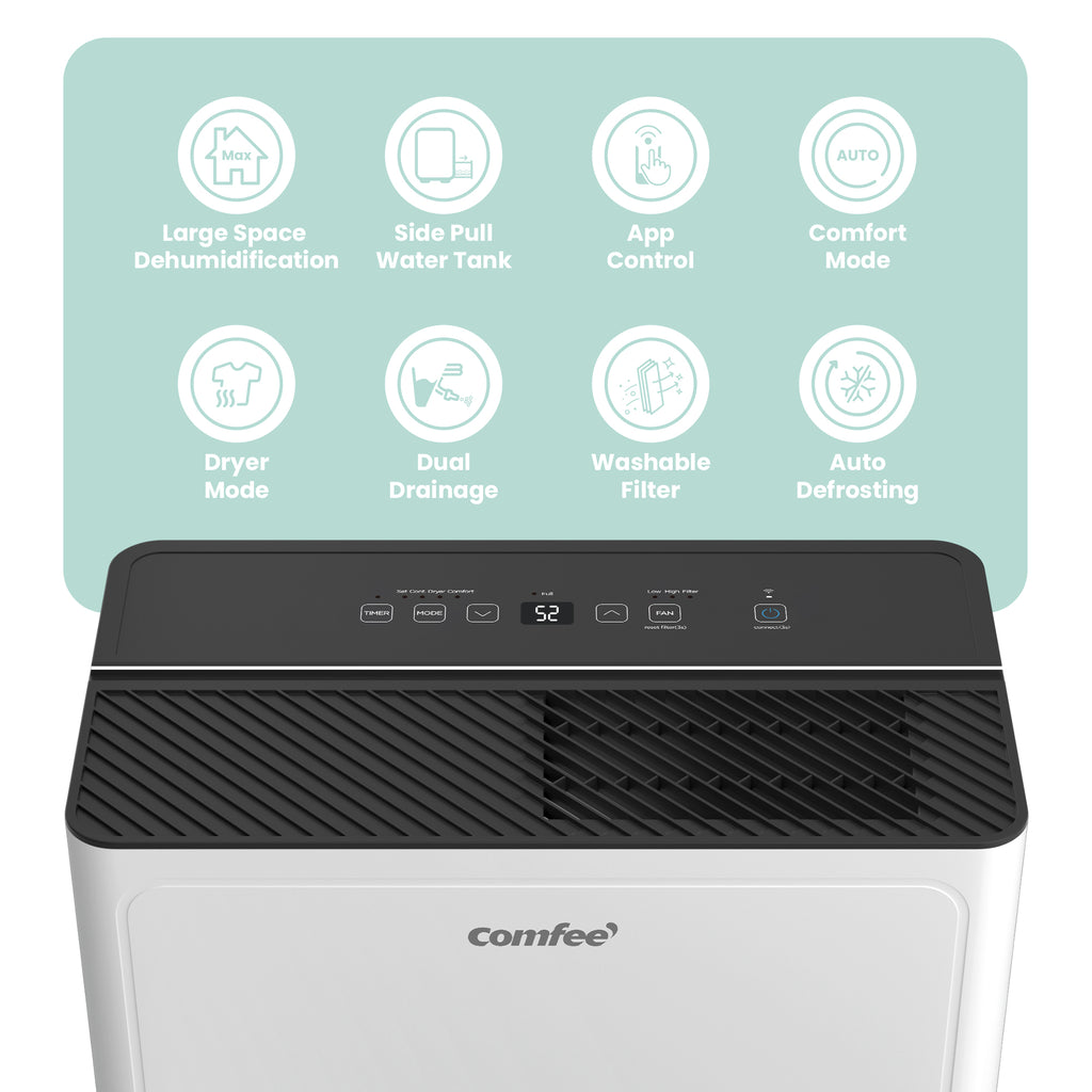 Banish moisture and enjoy a dry, comfortable living space with this 30L/day Dehumidifier. Featuring a 3.2L removable water tank, smart humidity sensing, and Wi-Fi connectivity, it efficiently removes excess moisture while offering convenient control via mobile app or Alexa. Its quiet operation, dual fan speeds, and portable design make it perfect for bedrooms, living rooms, or laundry areas.