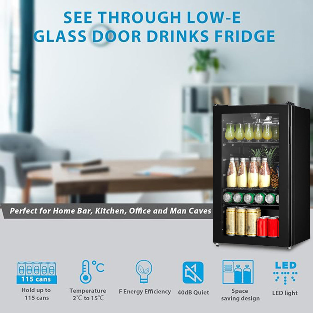 Keep drinks perfectly chilled with this compact 93L Fridge, ideal for creating a stylish indoor bar at home. Despite its small footprint, it offers ample storage for beverages. The full-length glass door and built-in LED lights provide clear visibility while maintaining insulation. With six adjustable cooling levels and quiet operation, it ensures convenience without disrupting your space.