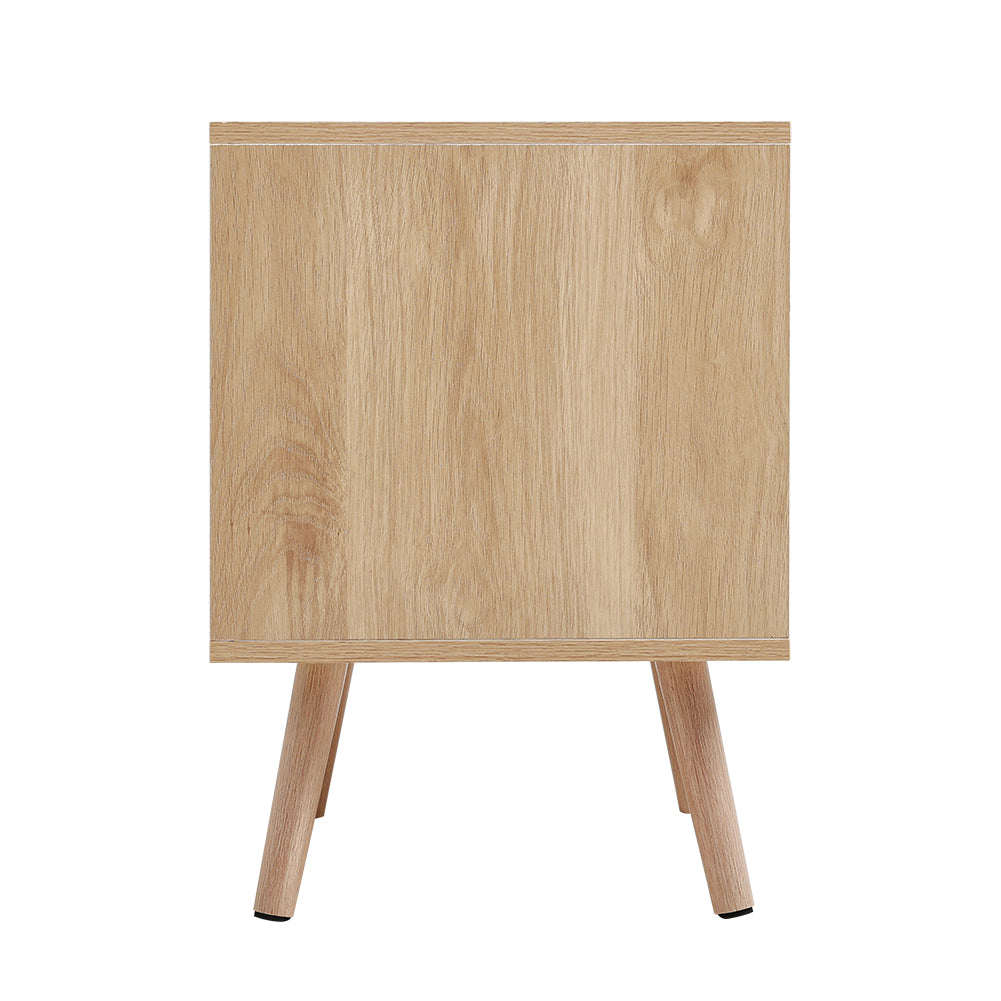 The side cabinet blends simple style with practicality. Made from sturdy wood and woven rattan, it features two smooth-gliding drawers for your essentials. The flat top is ideal for a lamp or books. Finished with tapered pine legs and long handles, it's easy to open and close.