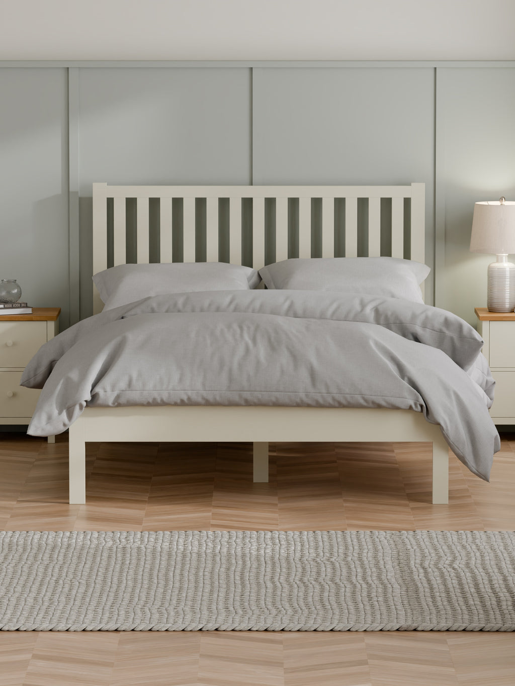 Elevate your bedroom with the Coxmoor 150cm Bed in Ivory and Oak, seamlessly blending comfort and style. Crafted from solid Ivory and Oak with a warm finish, this bed features a stunning paneled Ivory and Oak headboard that adds an element of elegance and texture to your space. Its clean, simple lines offer versatility, allowing it to harmonize beautifully with both modern and traditional decor. Designed for durability and long-lasting comfort, assembly is quick and straightforward, so you can enjoy your new bed with ease.