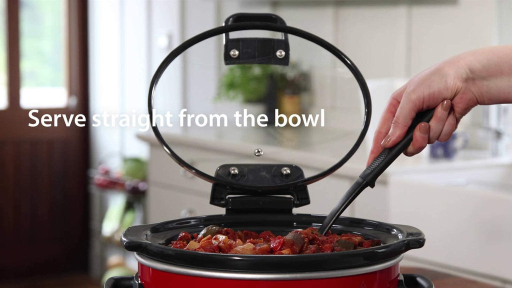 "This red Crockpot slow cooker is a great way to prepare lots of your favourite dishes. It has a 3.5 litre capacity, meaning youll be able to cook a delicious meal for 3-4 people. This model has 2 heat settings too, so youll always be able to create incredibly tasty dishes. Thanks to the glass lid, its really simple to check on your food without losing any heat. The oven-safe pot makes it effortless to reheat meals, while the handy keep warm function makes sure your food stays at just the right temperature until youre ready to eat as well.