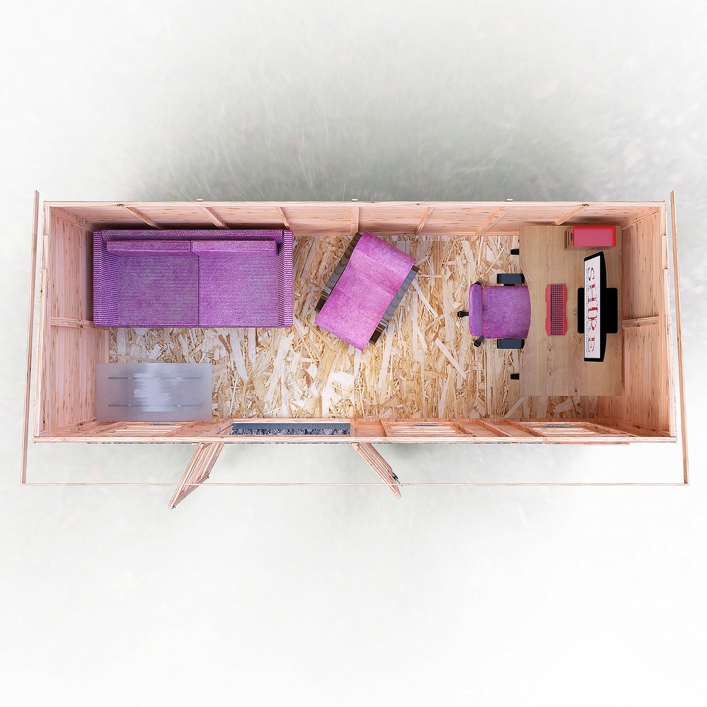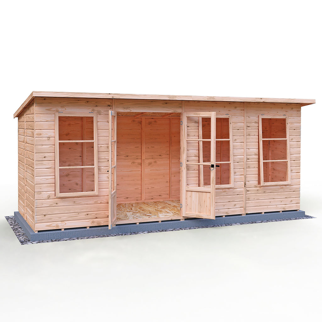 The Dahlia Summerhouse is complete with acrylic safety glazing with a window bar feature. Double doors, featuring engineered timber doors to prevent risk of warping, provide excellent access for furniture. Three opening windows are included to provide a welcome breeze. This lovely pent roof garden room is constructed from high grade shiplap cladding to the walls over 34mm strong framing with OSB floor and roof. Dipped base coat preservative ready for you to top coat.