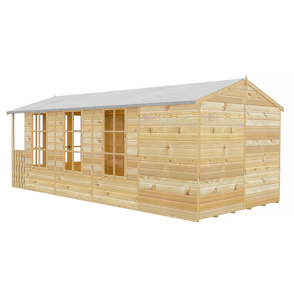 The Delmora is a beautiful, airy summerhouse with a glazed front featuring a pretty veranda. There are double doors giving easy access for your garden furniture and imagine dining here with the doors thrown open to enjoy your garden. The Delmora has opening windows, the number determined by the building size so please look at the plan drawing provided. All glazing is glass. This lovely garden room is constructed from high grade 12 mm pine shiplap boards over sturdy 34 mm x 34 mm framing. The floor and roof are 12 mm T&G with roof felt provided to complete the roof exterior. Interchangeable side panels so the window can go on either side. Dipped base coat preservative ready for you to top coat.