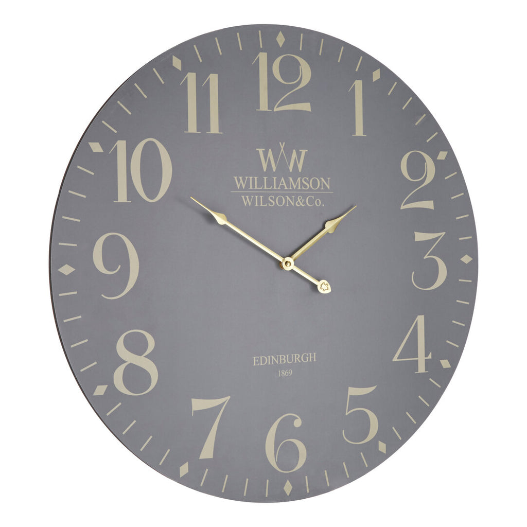 A beautiful and practical timepiece for your wall, this clock has large distinct numbers that contrast the grey face, making it easier to read. This clock features warm metallic hands that offer a luxe accent.